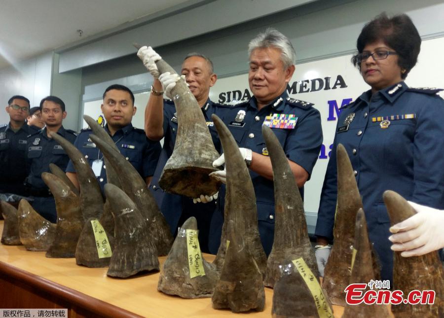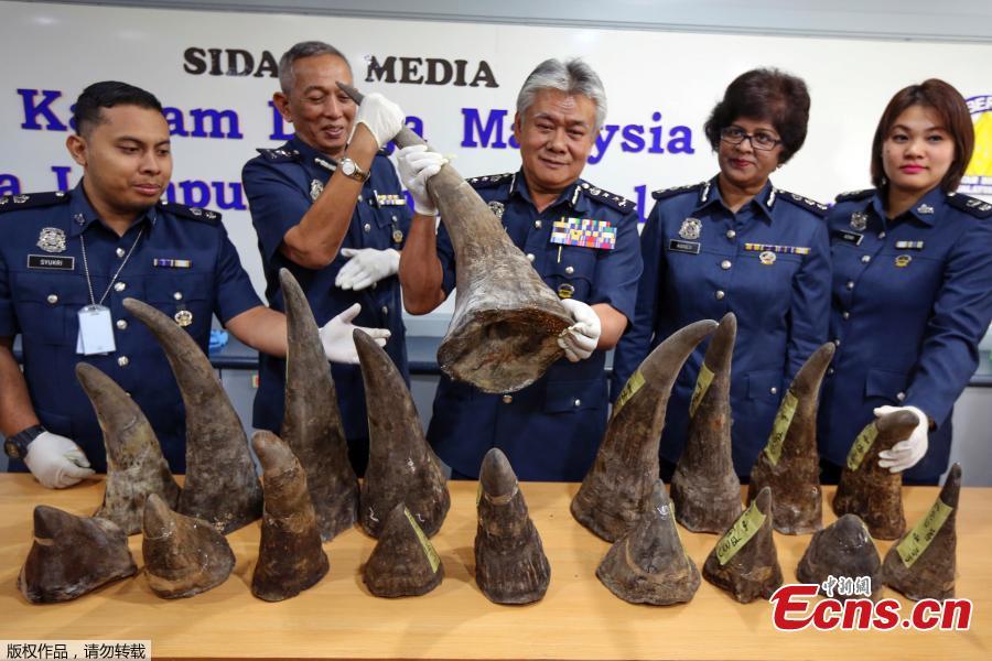 Kuala Lumpur International Airport (KLIA) customs director-general Hamzah Sundang, 2nd R, inspects the rhino horns that were seized at KL International airport during a press conference in Custom office in Sepang, Malaysia, April 10, 2017. A total of 18 Rhino horns weight of 51kg with a value of US$ 3.1 million were confiscated on April 7 from Mozambique to Kuala Lumpur via Doha. (Photo/Agencies)