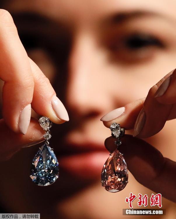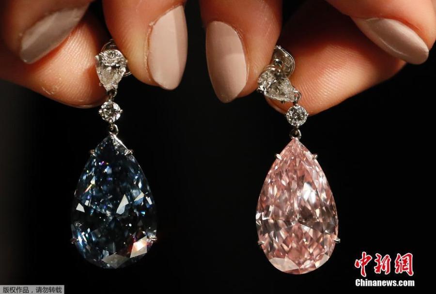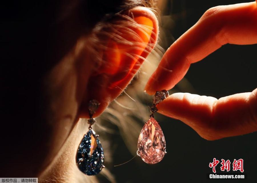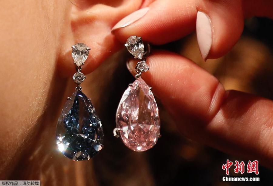 The Apollo and Artemis Diamonds, the most valuable earrings ever to appear at auction, unveiled at Sotheby's in London, April 10, 2017. The 14.54-carat Fancy Vivid Blue diamond and the 16-carat Fancy Intense Pink diamond will be offered as individual lots with a combined estimate of $50 million - $70 million at the Magnificent Jewels and Nobel Jewels sale in Geneva on May 16, 2017. (Photo/Agencies)