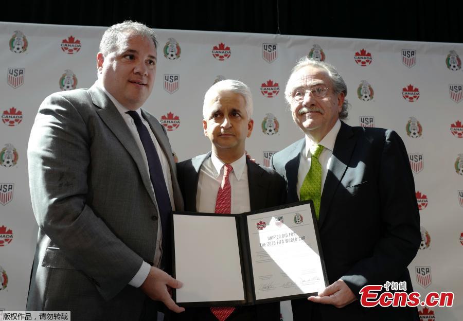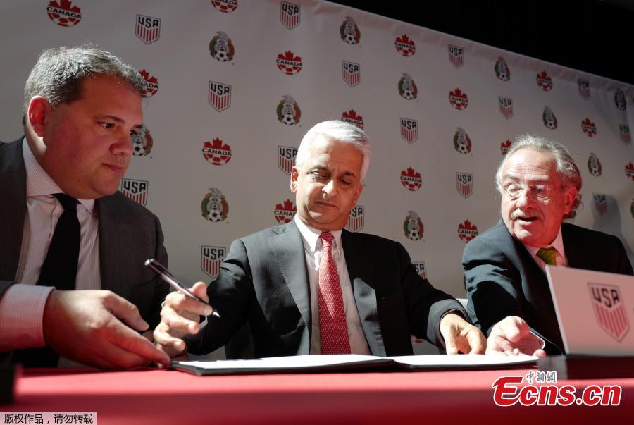 Victor Montagliani, left, President of the Canadian Soccer Association, Sunil Gulati, center, President of the United States Soccer Federation, and Decio de Maria, President of the Mexican Football Federation, show their unified bid to co-host the 2026 World Cup in New York, April 10, 2017. The soccer federations of the United States, Mexico, and Canada announced and signed an unprecedented bid for all three countries to host the 2026 World Cup. The bid stipulates that 60 of the 80 games of the tournament be played in the United States, with Canada and Mexico each hosting 10 apiece. Sunil Gulati explained the decision to have the United States, Canada and Mexico submit a joint bid to host the 2026 World Cup, calling it “a hugely positive signal and symbol of what we can do together in unifying people.” (Photo/Agencies)
