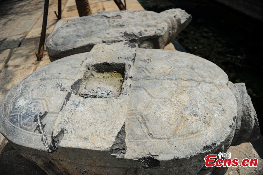A close-up view of relics found at the ruins of a Ming Dynasty (1368-1644) holiday palace in Jinan City, the capital of East China’s Shandong Province, April 11, 2017. Archeologists found tiles and construction components bearing the words "Mt. Tai Palace". (Photo: China News Service/Zhang Yong)