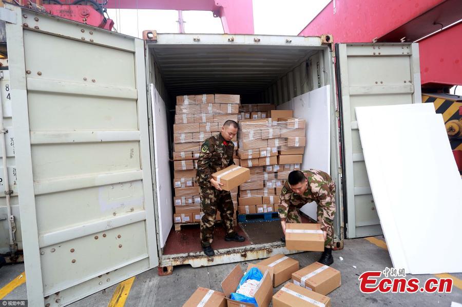 Chinese police officers check cartons of smuggled frozen meat in Shenzhen City, South China’s Guangdong Province, April 11, 2017. A boat was intercepted in the early morning on March 10 and found to have 630 tons of smuggled frozen meat, including chicken feet and pork chops. The seized meat is estimated to have a market value of 37 million yuan ($5.4 million). Shenzhen authorities have seized more than 3,427 tons of smuggled frozen meat since the second half of 2015, and this has a total market value of 260 million yuan. (Photo/CFP)