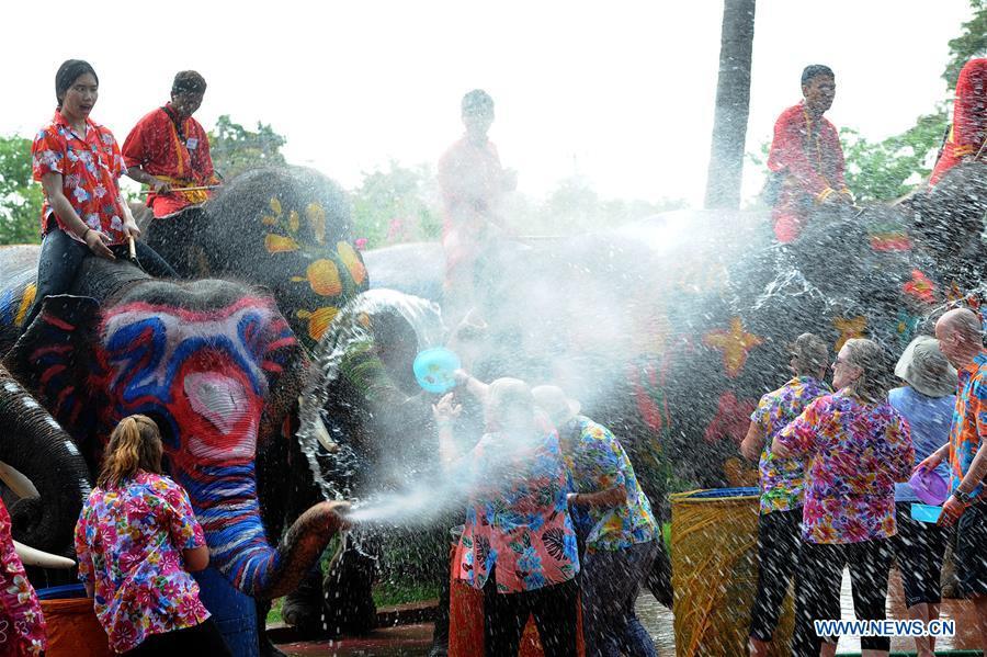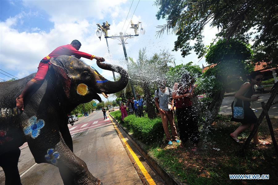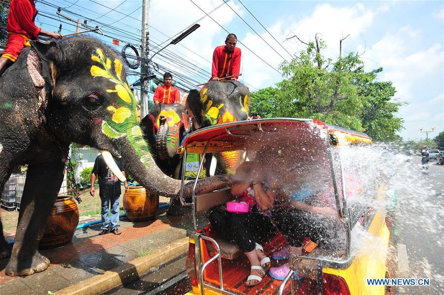 An elephant sprays water on tourists during a celebration for the upcoming Songkran festival in Ayutthaya, Thailand, April 11, 2017. The Songkran festival is the traditional Thai New Year's Day, during which people are accustomed to splashing water on others to rinse away misfortune and vice.(Xinhua/Rachen Sageamsak)