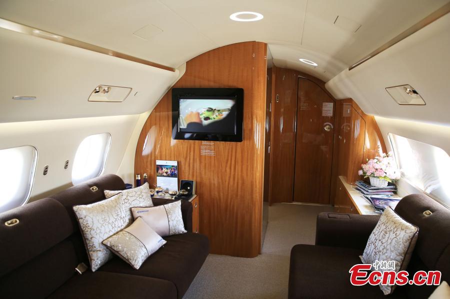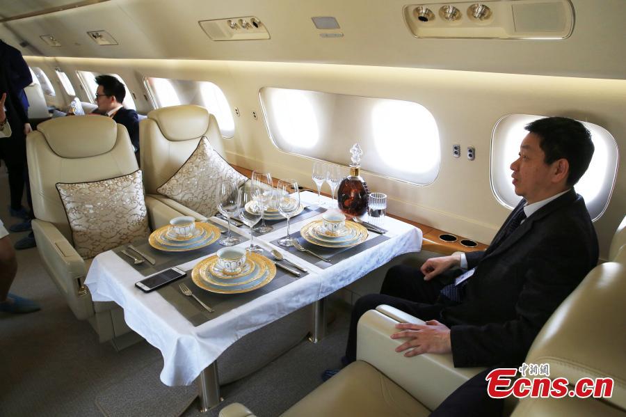 Visitors look inside a business jet at the Asian Business Aviation Conference & Exhibition (ABACE2017) in Shanghai, April 12, 2017. (Photo: China News Service/Pan Suofei)
