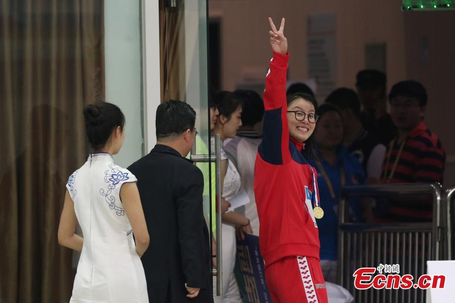 Swimmer Fu Yuanhui reacts after winning the women’s 100m backstroke in the National Swimming Championship in Qingdao City, East China’s Shandong Province, April 12, 2017. Fu broke her previous national record with a time of 58.72 seconds. (Photo: China News Service/Han Haidan)