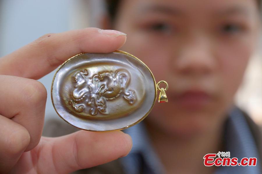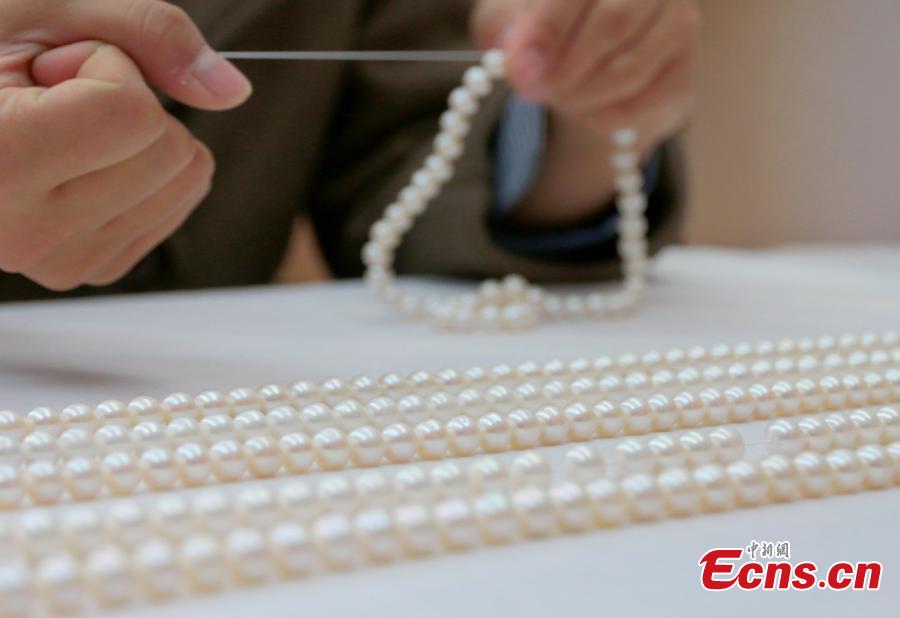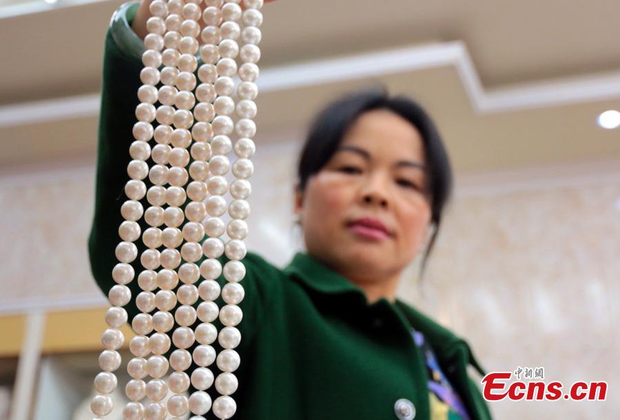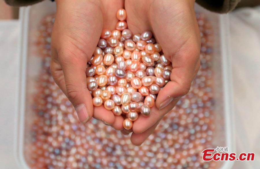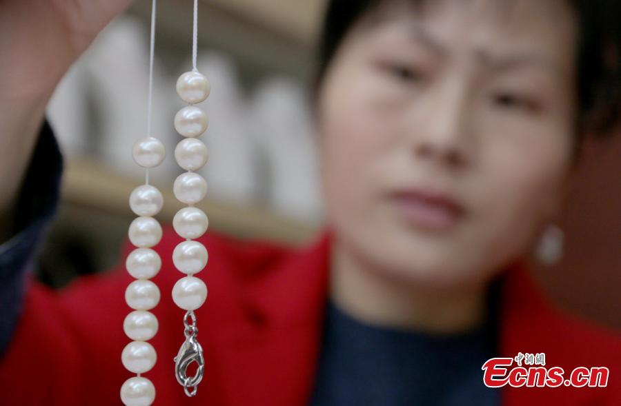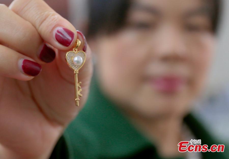 Pearl products made in unusual shapes are put on display in Wannian County, East China’s Jiangxi Province. Thanks to Poyang Lake, the county is home to the largest freshwater pearl farm in China. The pearls produced here are also known for their high quality and attractive appearance. (Photo: China News Service/Chen Fenghua)