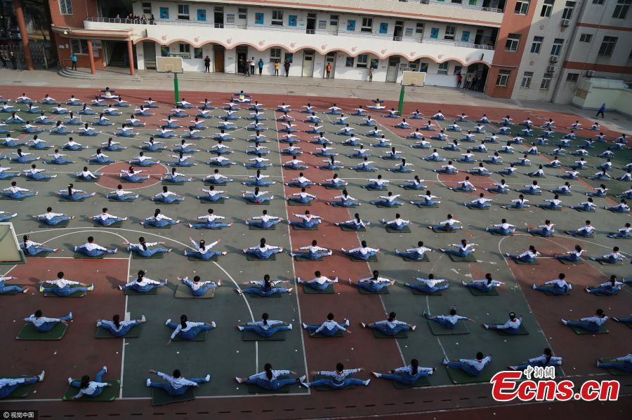 Hundreds of students exercise at an elementary school in Jinan City, the capital of East China’s Shandong Province, April 13, 2017. The school choreographed the active movement that combined gymnastics and yoga to keep students fit and healthy. (Photo/VCG)