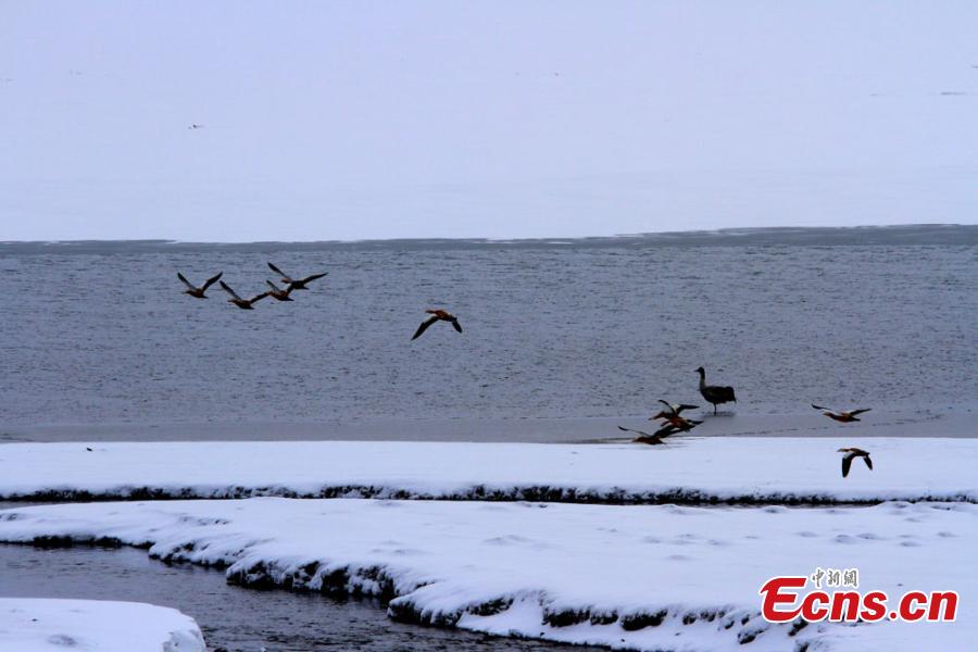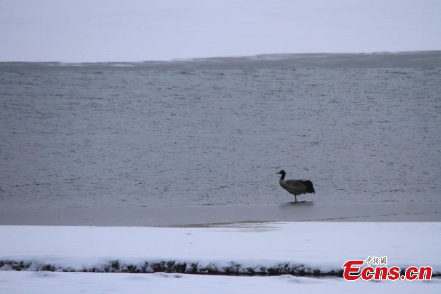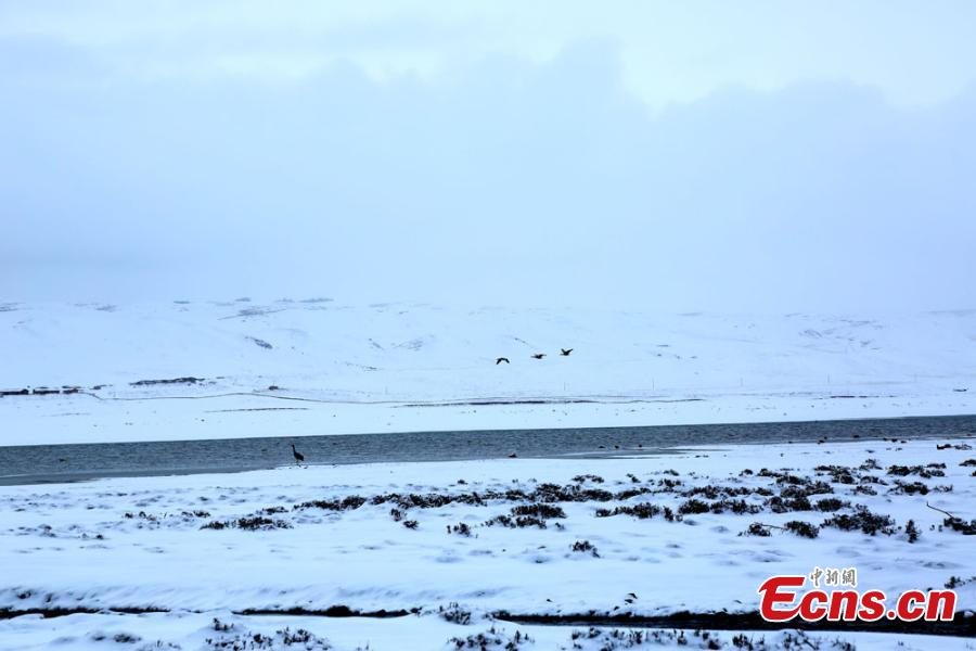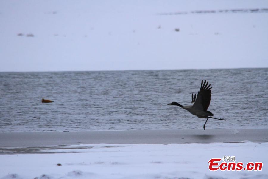 A black-necked crane, which is under first-class animal protection in China, stands in water at the snow-covered Hexi Corridor in Shandan County, Northwest China’s Gansu Province. Better environmental protection in the area has resulted in the arrival of more wild animals. (Photo: China News Service/Chen Li)