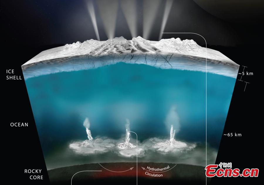 This graphic illustrates how scientists on NASA's Cassini mission think water interacts with rock at the bottom of the ocean of Saturn's icy moon Enceladus, producing hydrogen gas. NASA's Cassini spacecraft detected the presence of molecular hydrogen in water plumes erupting from Saturn's icy moon Enceladus, the U.S. space agency announced Thursday, suggesting that the distant world has almost all the conditions necessary for life. (Photo/Agencies)