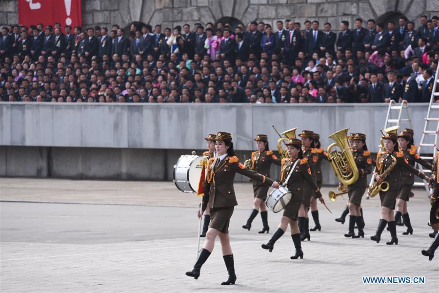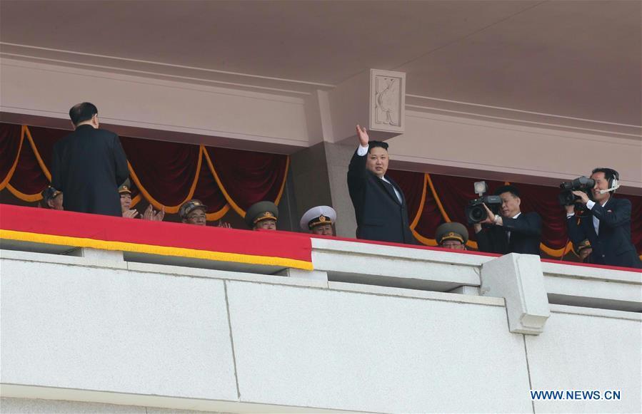 Kim Jong Un (R), supreme leader of the Democratic People's Republic of Korea (DPRK), waves as he reviews the grand celebrations marking the 105th birth anniversary of DPRK founder Kim Il Sung in central Pyongyang, April 15, 2017. DPRK on Saturday showcased its military muscles by parading all of its most advanced ballistic and tactic missiles, including a submarine-launched ballistic missile which could strike targets 1,000 kilometers away. (Xinhua/Zhu Longchuan)