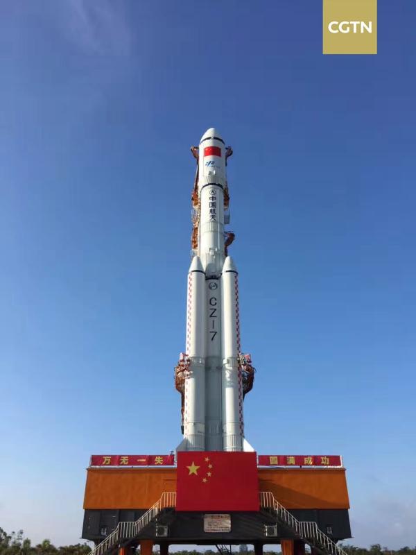 A Long March-7 Y2 carrier rocket was transferred to the launch pad at Wenchang Satellite Launch Center, Hainan Province on Monday morning, ready for the launch mission of Tianzhou-1.