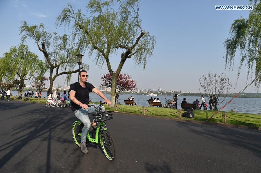 Tim Clancy, an Australian who has lived in Hangzhou for six years with his Chinese wife, pays the water bill through mobile phone in Hangzhou, capital of east China's Zhejiang Province, April 14, 2017. Tim took his American friend to make a cash-free travel for one day in Hangzhou, with mobile phones being used to pay all of their costs. Dubbed the world's largest mobile payment city, more than 98 percent of Hangzhou's taxis, over 95 percent of supermarkets and convenience stores, and more than 50 percent of restaurants in Hangzhou have access to mobile payment services. With smartphones, tourists in Hangzhou can use mobile payment service when shopping, dining, or calling a cab. (Xinhua/Huang Zongzhi)