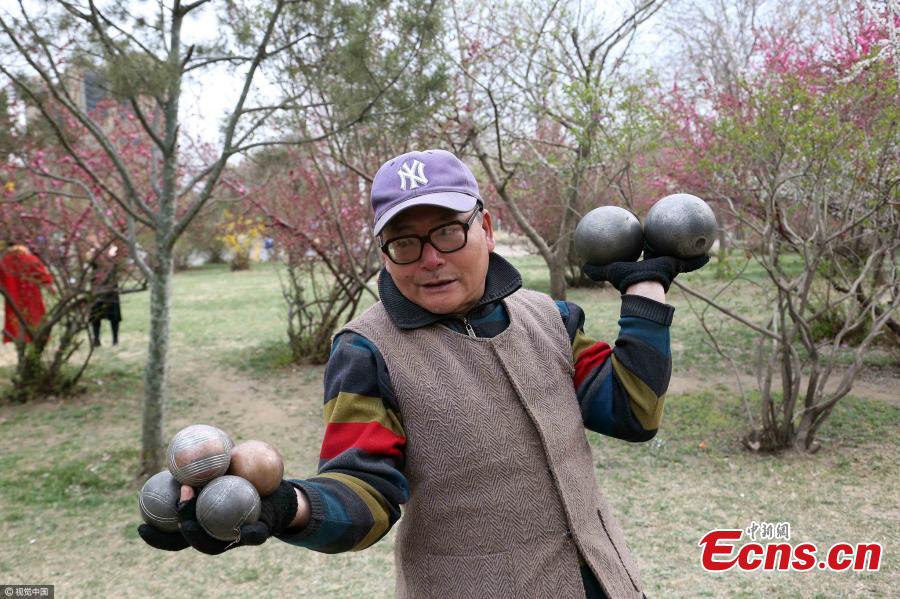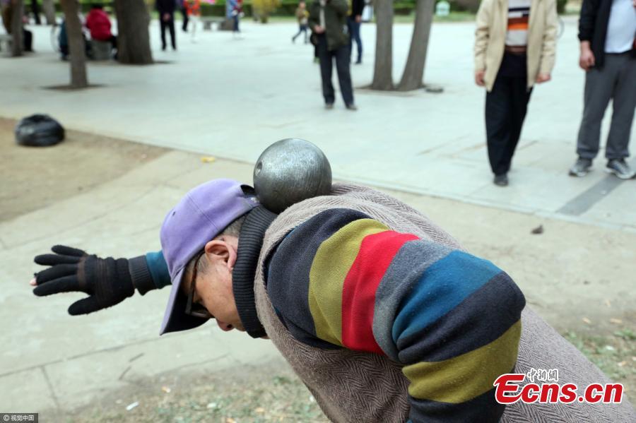 Piao Yingmin, 61, shows his stunts with iron balls at a park in Shenyang City, the capital of Northeast China’s Liaoning Province, April 16, 2017. Piao said he started practicing with iron balls over 30 years ago after seeing them used as a deadly weapon in a kung fu movie. Piao said he works out with iron balls six hours a day and wants to apply for a Guinness World Record. (Photo/VCG)