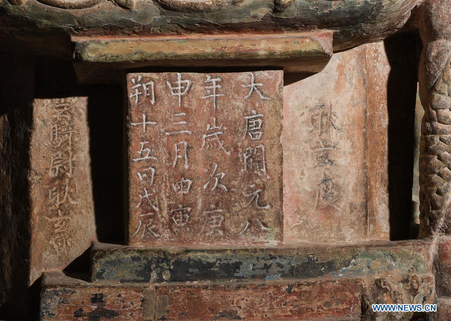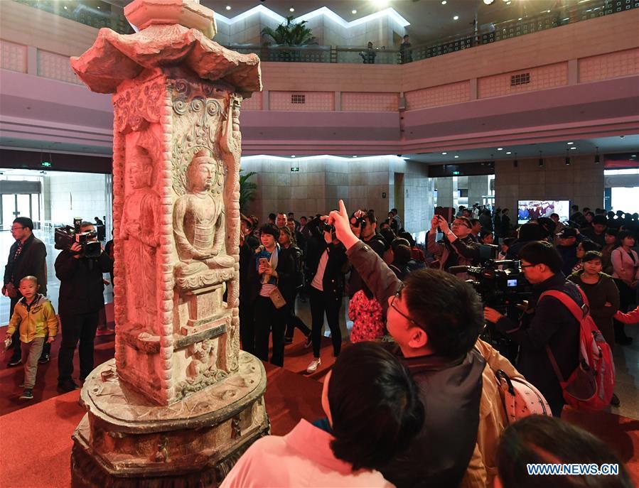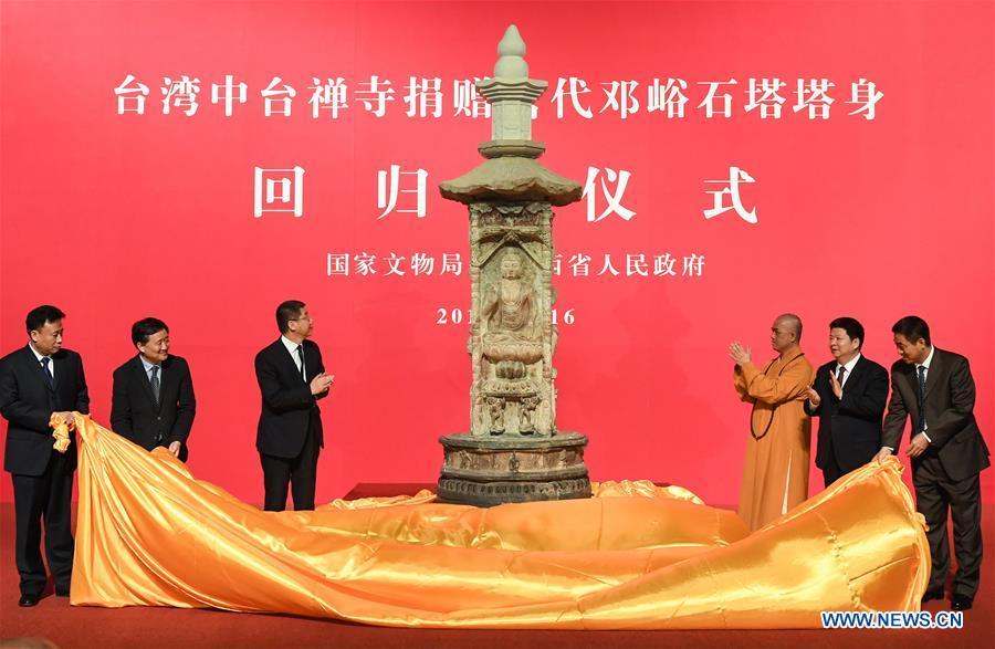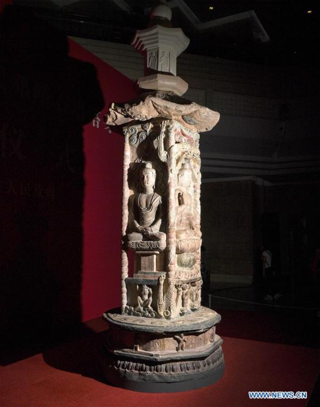 Photo taken on April 15, 2017 shows the Dengyu stone tower in Taiyuan, capital of north China's Shanxi Province. A donation ceremony was held Sunday for a Taiwanese monastery to return an ancient pagoda body that was stolen 19 years ago from Shanxi Province. Dengyu stone tower, originally located in Dengyu village of Yushe county, Shanxi, features Buddha images carved into the four-faced tower body. The colorful piece was made in the Tang Dynasty (618-907). (Xinhua/Li He)