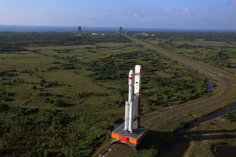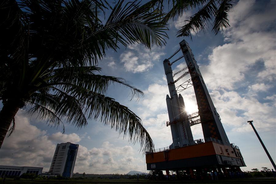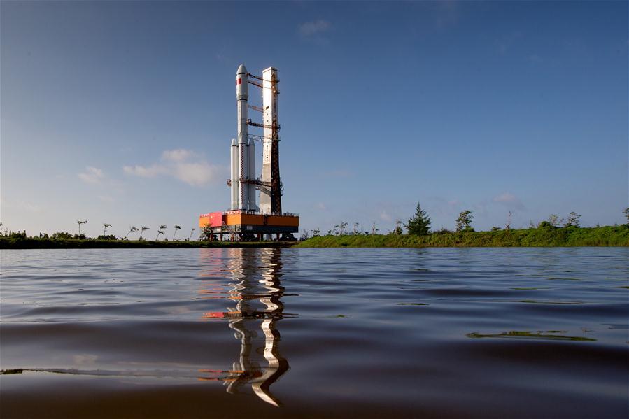 Photo taken on April 17, 2017 shows the cargo spacecraft Tianzhou-1 being transferred with a Long March-7 Y2 carrier rocket from the testing center to the launch zone in Wenchang, south China's Hainan Province. China's first cargo spacecraft Tianzhou-1 is to be launched into space between April 20 and 24, according to the office of China's manned space program. (Xinhua/Ju Zhenhua)