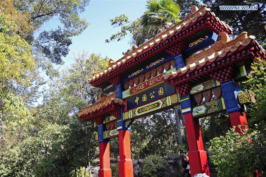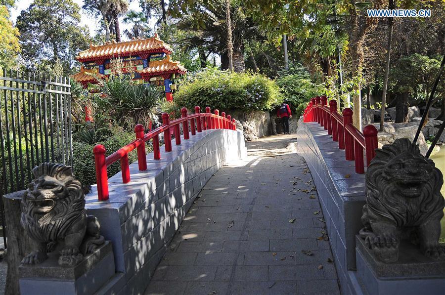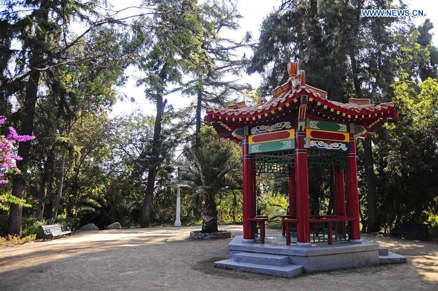 Photo taken on April 13, 2017 shows sculptures in the Chinese Garden at O'Higgins Park, in Santiago, capital of Chile. The Chinese Garden is located in the southeast part of Santiago's O'Higgins Park. In January 2017, the garden was reopened to the public after the restoration by the collaboration of Chilean and Chinese institutions. (Xinhua/AGENCIAUNO)