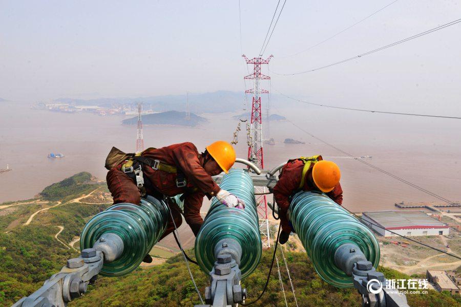 Workers carried out the final check of electricity transmission lines on a transmission tower in Daishan County in Zhoushan, Zhejiang province. The towers began operation on April 18. With a total investment of $78 million, the renovation is a major project of Zhejiang province's 12th Five-Year Plan. (Photo/zjol.com.cn)
