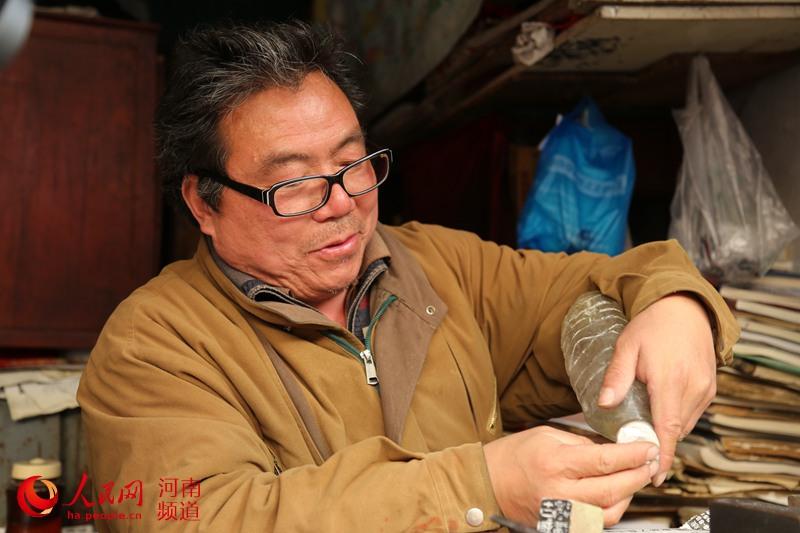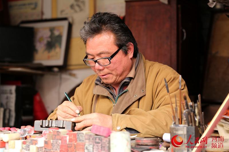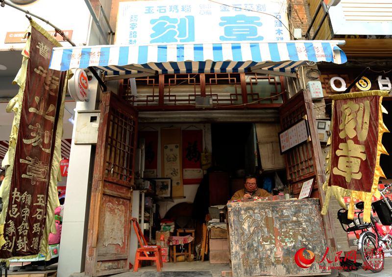 Seal-carving artist Li Puyi demonstrates his skills in his shop in Luoyang, Henan province. Li's family has been in the seal-carving business for more than 80 years, and Li's shop has been open for over two decades. Li acknowledged that the traditional skill of seal-carving has begun to lose its competitive edge since the advent of computer-designed seals, but he still hopes to pass on his skills to the next generation. (Photo/People's Daily Online)