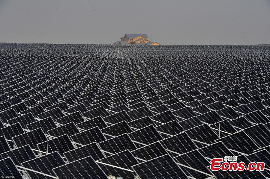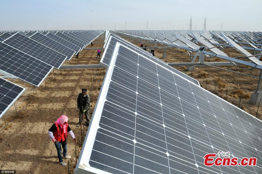 A wide array of solar photovoltaic panels in Yinchuan City, Northwest China’s Ningxia Hui Autonomous Region, April 18, 2017. Under the solar photovoltaic panels are Chinese boxthorns covering an area of 6,667 hectares. The plant’s wolfberry fruit is often used in traditional Chinese medicine. (Photo/VCG)