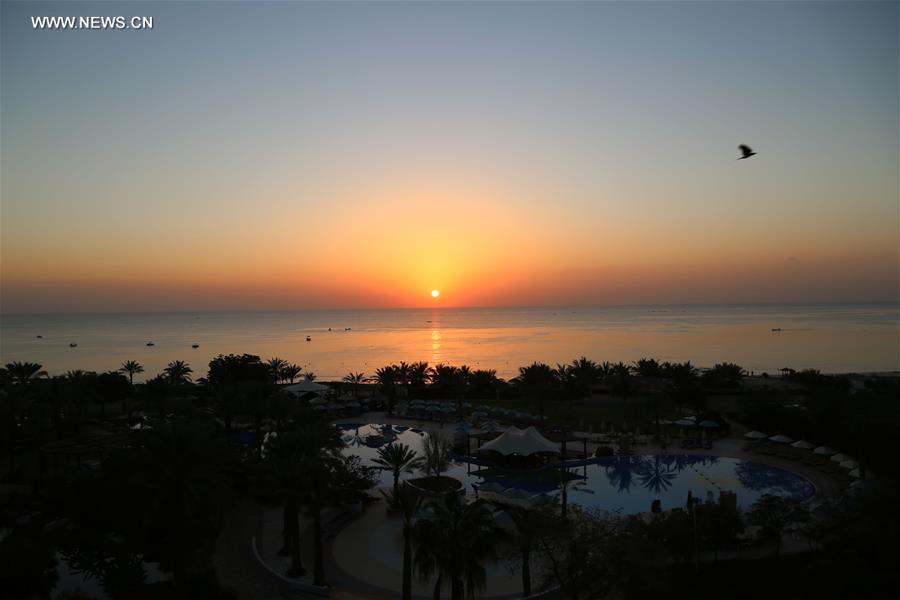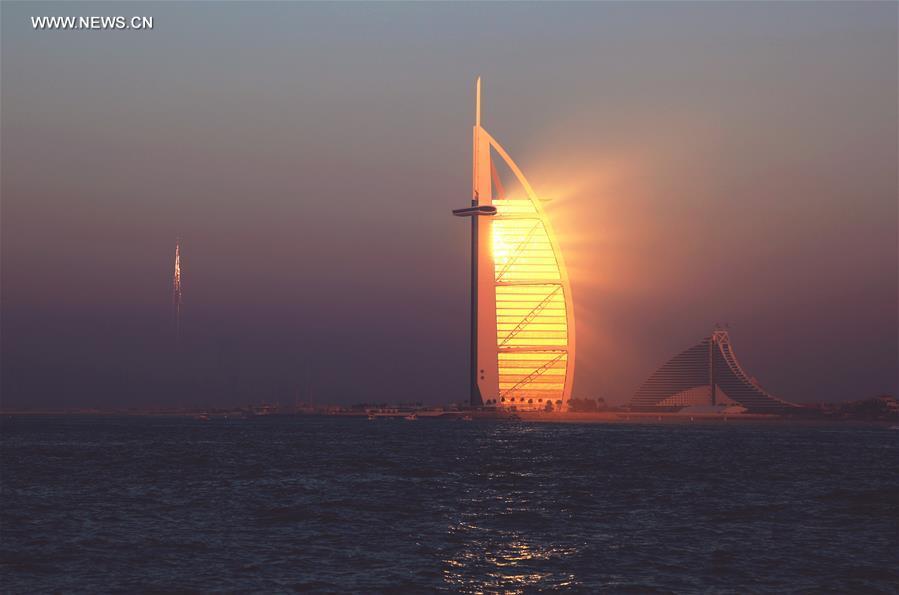 The hotel Burj Al-Arab is seen during sunset in Dubai, the United Arab Emirates (UAE), Dec. 30, 2016. The UAE, located at the intersection of the Belt and Road Initiative, is an important partner for China to promote the Belt and Road Initiative. (Xinhua/Li Zhen)