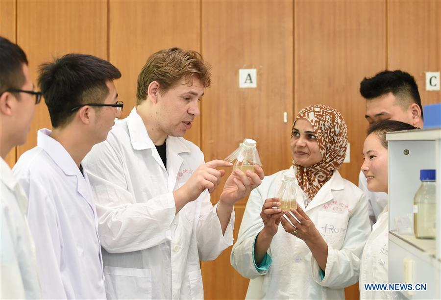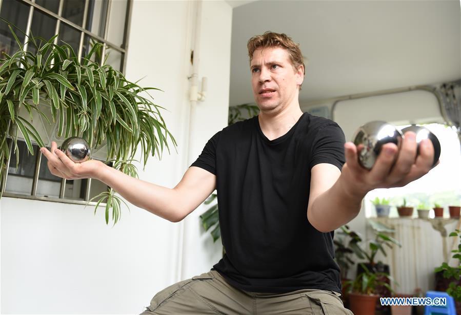 Arend F. van Peer (Top) practices with his master Lin Zaipei the Dog Kung Fu in Fuzhou, capital of southeast China's Fujian Province, April 18, 2017. Arend, 39, was from the Netherlands. He and his wife Khingeeva Tatyana came to China in October 2013. Besides doing research and teaching as a professor at a laboratory in School of Life Sciences in Fujian Agriculture and Forestry University, Arend was a fan of Chinese martial arts. As students of Kung Fu master Lin Zaipei, Arend and his wife learned the Dishuquan, which is also known as the Dog Kung Fu, one of the most popular martial arts styles in Fujian Province and a national intangible cultural heritage. They went to the martial art club every week to practice with Dog Kung Fu lovers from all over the world. Arend said that learning Chinese Kung Fu has been his dream since childhood. He invited Chinese Kung Fu masters, including his master Lin, to the Netherlands for culture exchange. "Arend has mastered a series of skills of Dog Kung Fu and he is capable of teaching these skills" said Lin. On May 3, 2017, Arend and his wife will finish their work in China and leave for the Netherlands. They plan to introduce the Dog Kung Fu to the people in their country. (Xinhua/Lin Shanchuan)