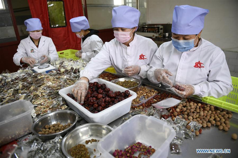 Staff members make Eight Treasures Tea at a tea making company in Tongxin County, Wuzhong City, northwest China's Ningxia Hui Autonomous Region, April 20, 2017. Eight Treasures Tea is a famous Chinese herbal tea that is said to be recipe for beauty and health. (Xinhua/Wang Peng)