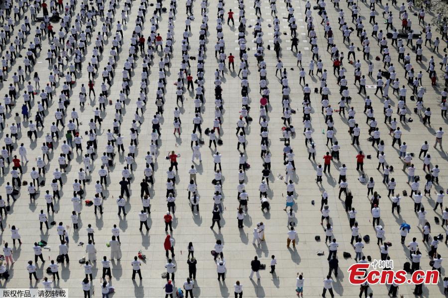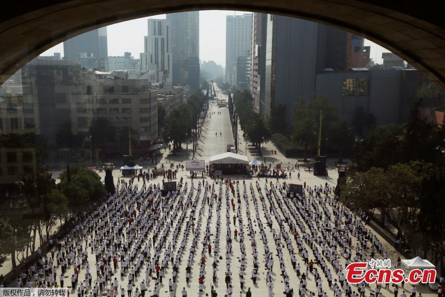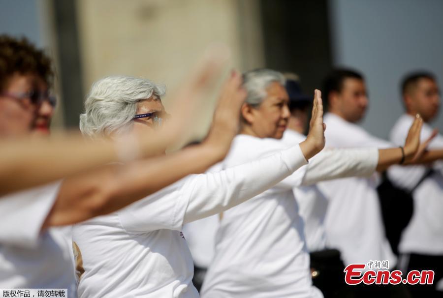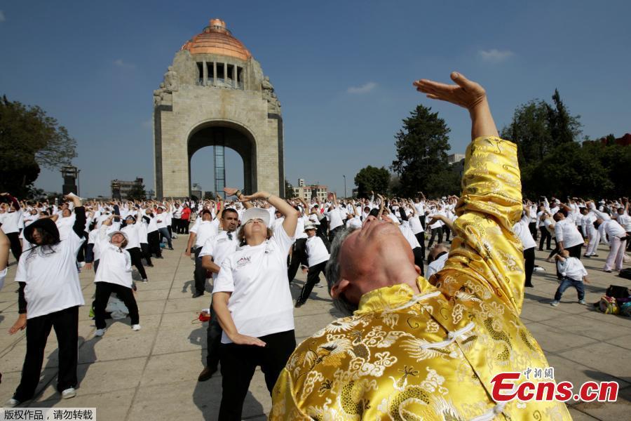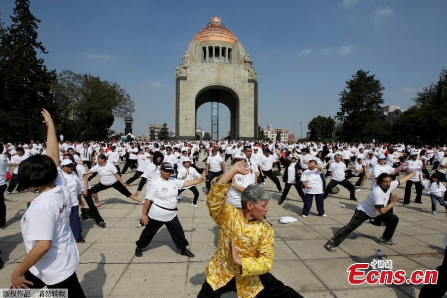 People take part in a mass Tai Chi class as part of All United for Tai Chi, a national movement to improve health, at the Revolution Monument in Mexico City, Mexico, April 23, 2017.(Photo/Agencies)