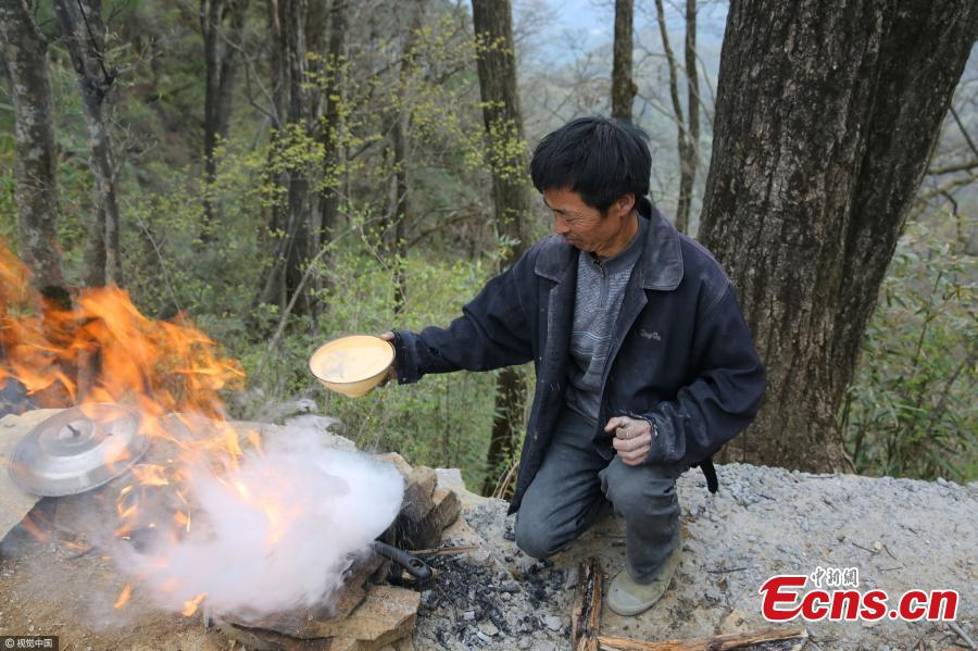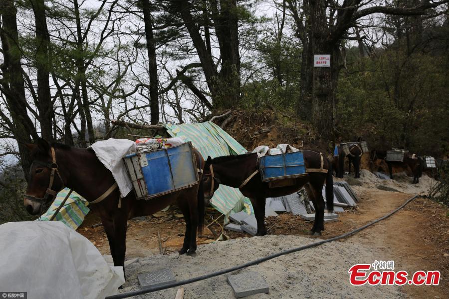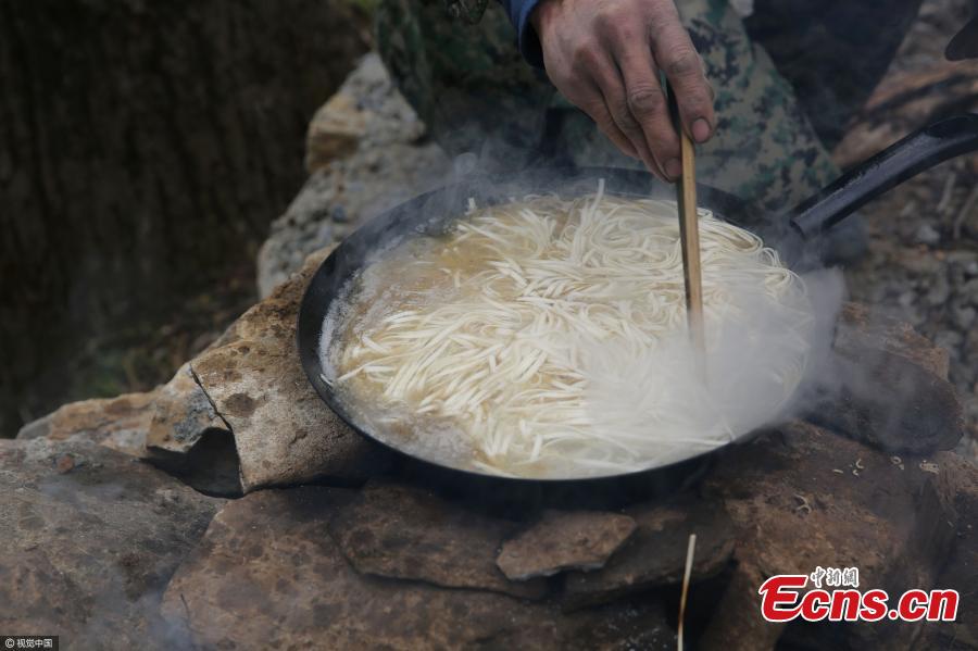 Yao Bentang, chief of a mule train, eats together with other villagers on Yunwu Mountain in Shiquan County, Northwest China’s Shaanxi Province, April 20, 2017. Yao, 56, leads four other villagers in using 10 mules to transport construction materials for building a mountain walkway. Working from 7 am to 6 pm, one mule can bring in a daily income of 300 yuan ($72) at most. Yao said they can eat simple food at a cost of 10 yuan a day, mostly noodles, but he usually spends 20 yuan for a mule’s food. (Photo/VCG)