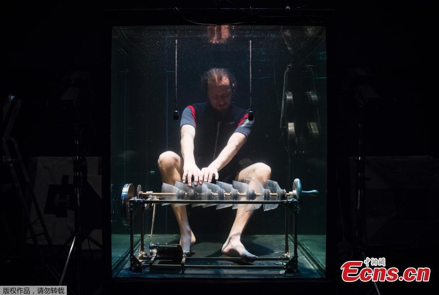 A member of the Between Music band, performs with a custom-made instrument in a glass water tank during a rehearsal ahead of the AquaSonic underwater concert on April 19, 2017 in Aarhus, Denmark.