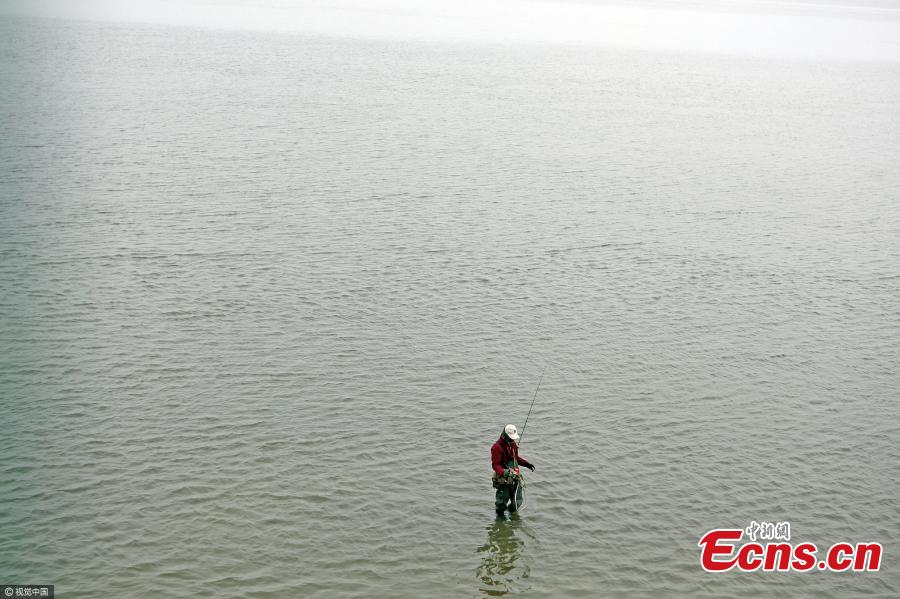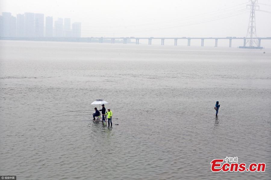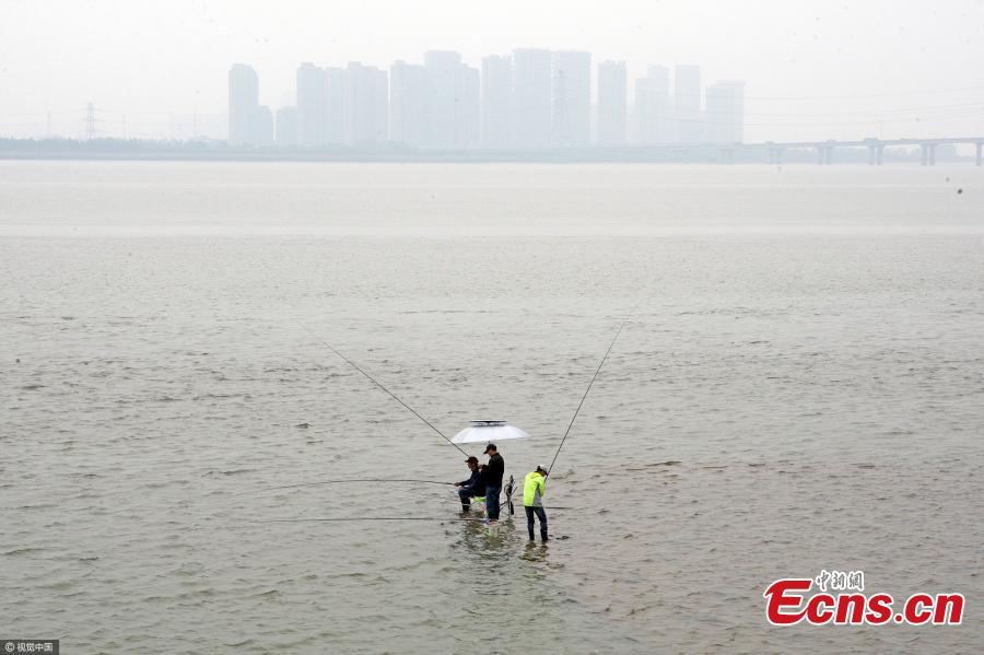People ignore warnings and fish on a submerged bank of the Qiantang River in Hangzhou City, the capital of East China’s Zhejiang Province, April 24, 2017. (Photo/VCG)