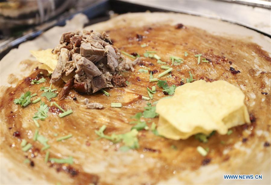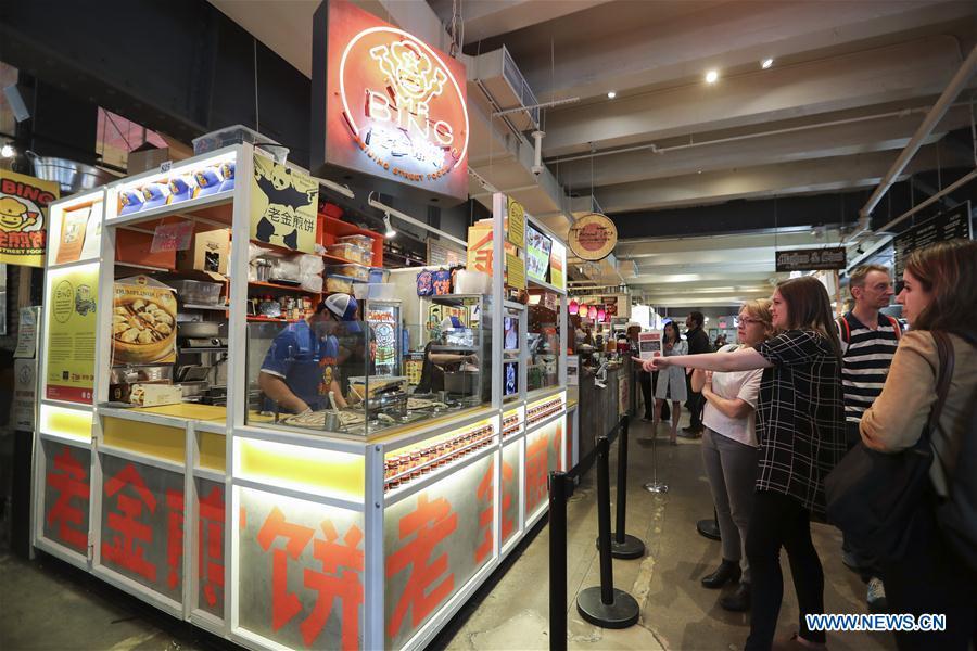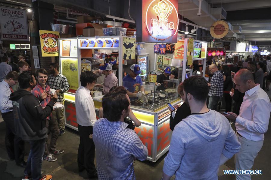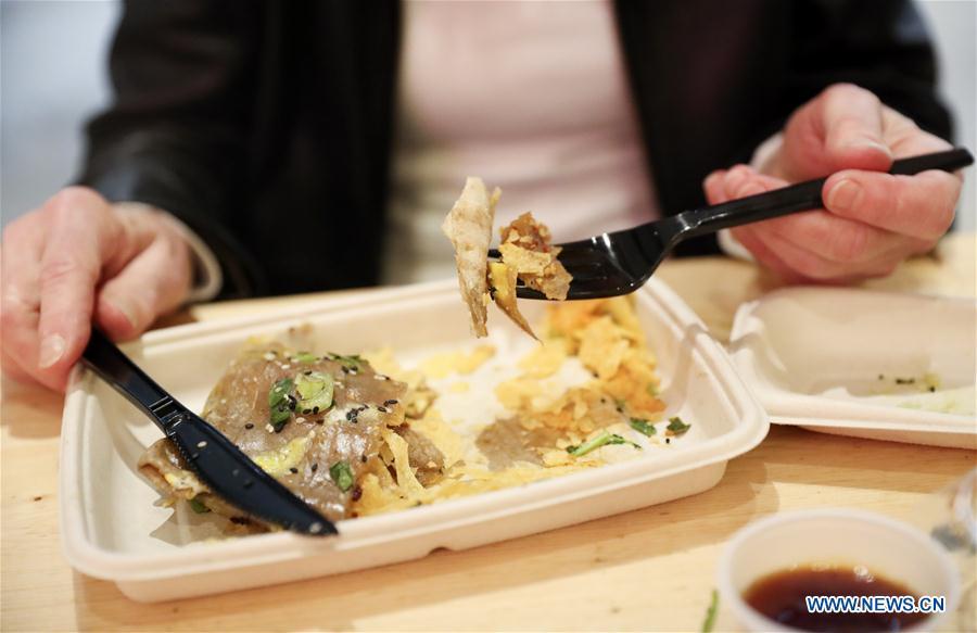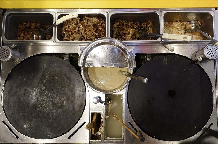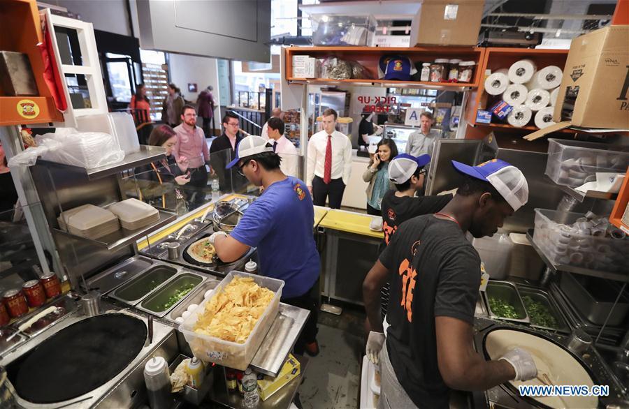 Brian Goldberg makes Jianbing at the kiosk of Mr. Bing in UrbanSpace food court in New York, the United States, April 17, 2017.