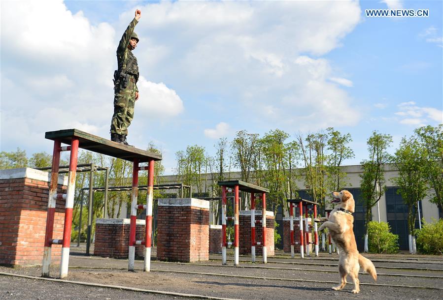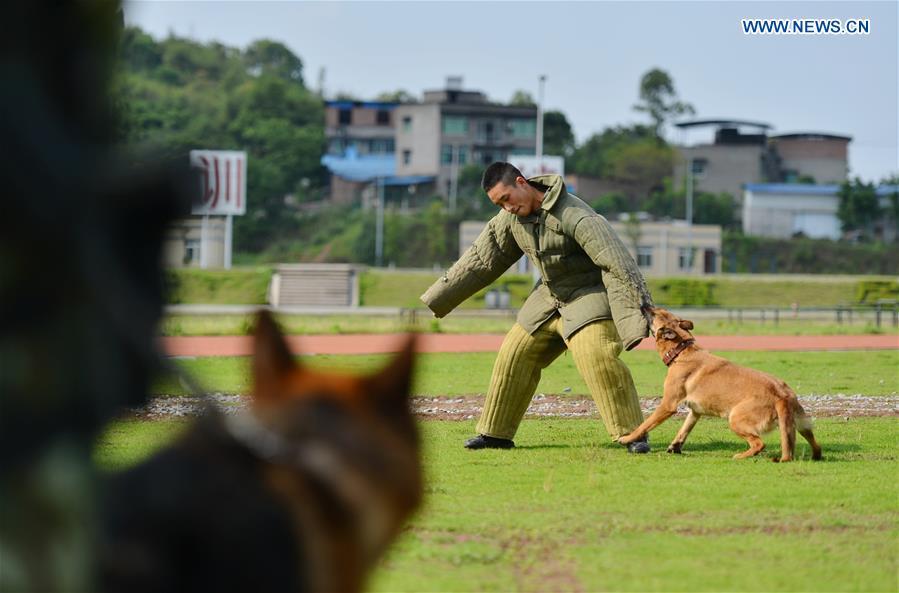 Police dogs are trained at a training base in Chongqing, southwest China, April 29, 2017. (Xinhua/Cao Feng)