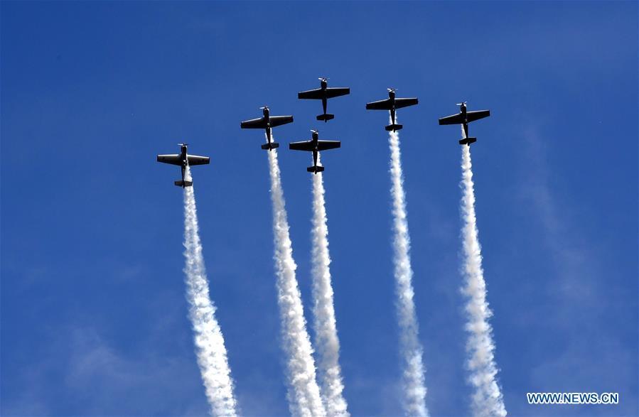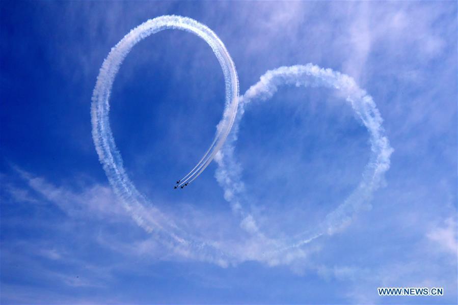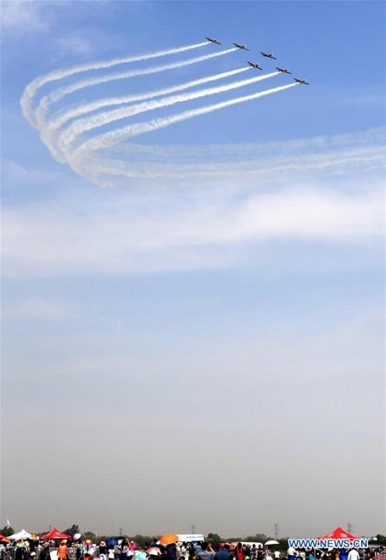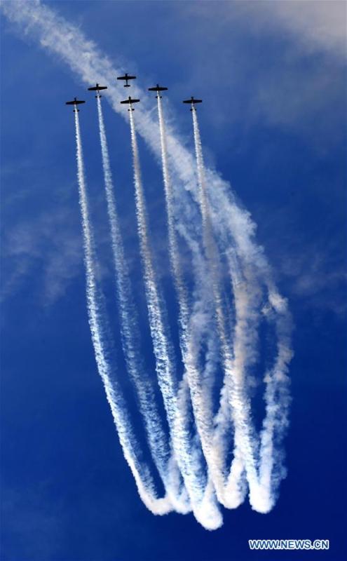 Aerobatic aircraft perform during the AirShow 2017 in Zhengzhou, capital of central China's Henan Province, April 30, 2017. The AirShow Zhengzhou will last till May 1. (Xinhua/Zhu Xiang)