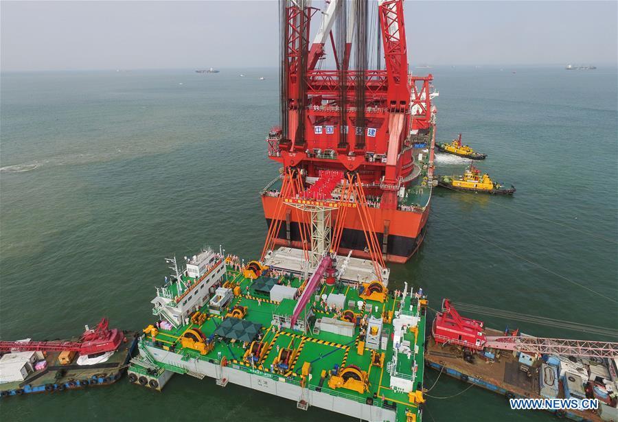 A gigantic crane, which was transformed from a tanker, hoists a 6,000-ton key structure of the world's longest cross-sea bridge linking Hong Kong, Zhuhai and Macao, May 2, 2017. The wedge, 12-meter-long and weighing more than 25 Airbus A380 jets, was lowered to connect the immersed tubes of the underground tunnel of the bridge. The 55-kilometer bridge connects Zhuhai in Guangdong Province with Hong Kong and Macao. It includes a 22.9-km bridge and 6.7-km underground tunnel. (Xinhua/Liu Dawei)