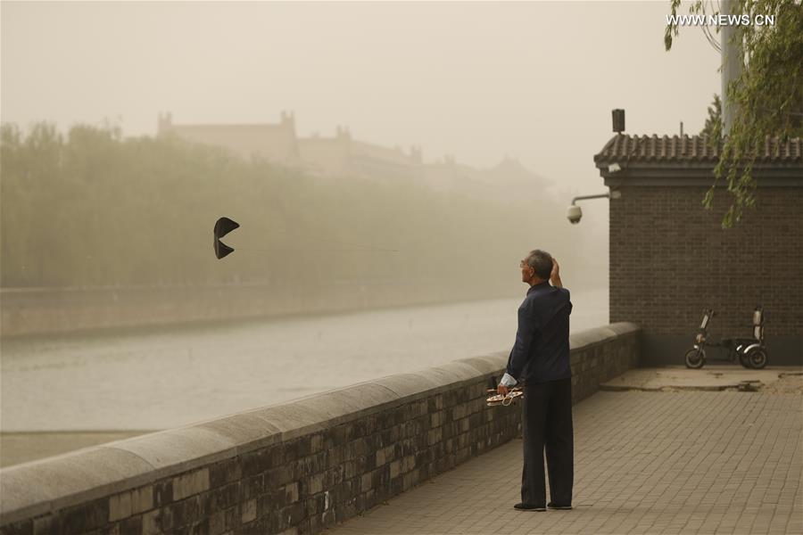 Tourists in mask visit Wanchun Pavilion in Jingshan Park in Beijing, capital of China, May 4, 2017. A sandstorm swept over much of north China including Beijing on Thursday, turning the sky yellow and obscuring visibility. The city's meteorological center issued a blue alert for sandstorms Thursday morning, forecasting winds to carry sand and dust across the capital. (Xinhua/Shen Bohan)