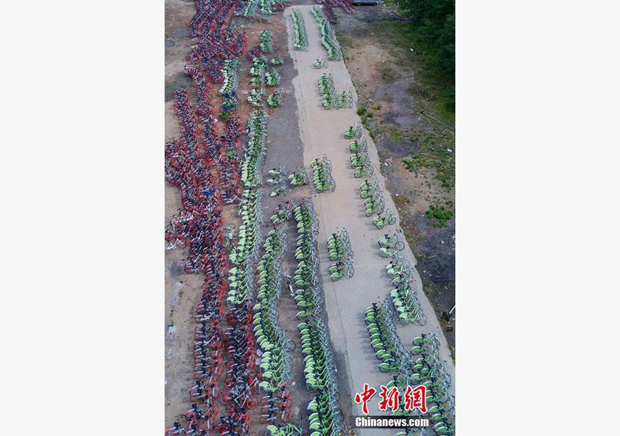 Aerial photo shows various sharing bikes lined up at a parking area in Nanjing, May 5, 2017. The bike-sharing business, which took off in major Chinese cities less than two years ago, has seen a growing number of shared bikes from different companies. (Photo/China News Service)