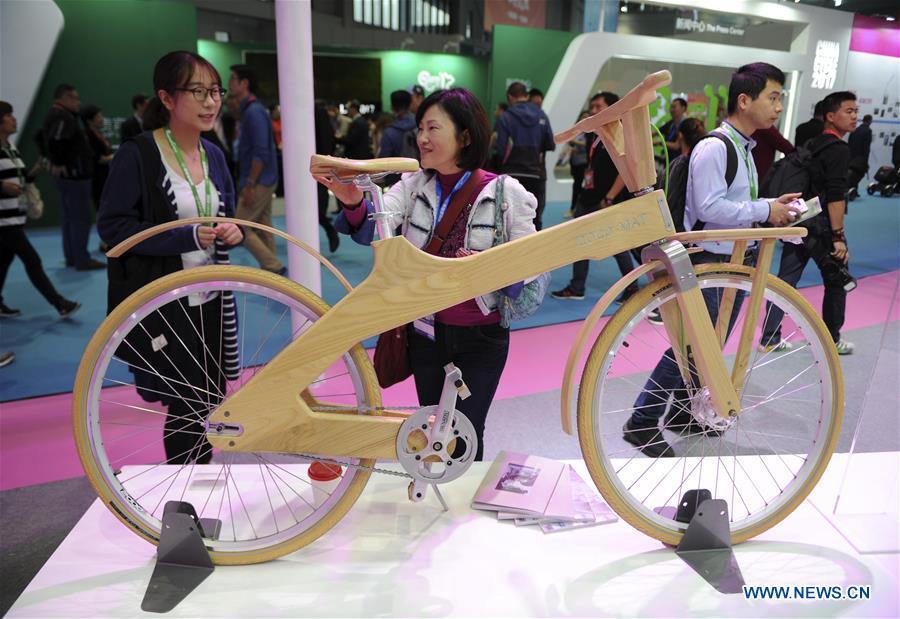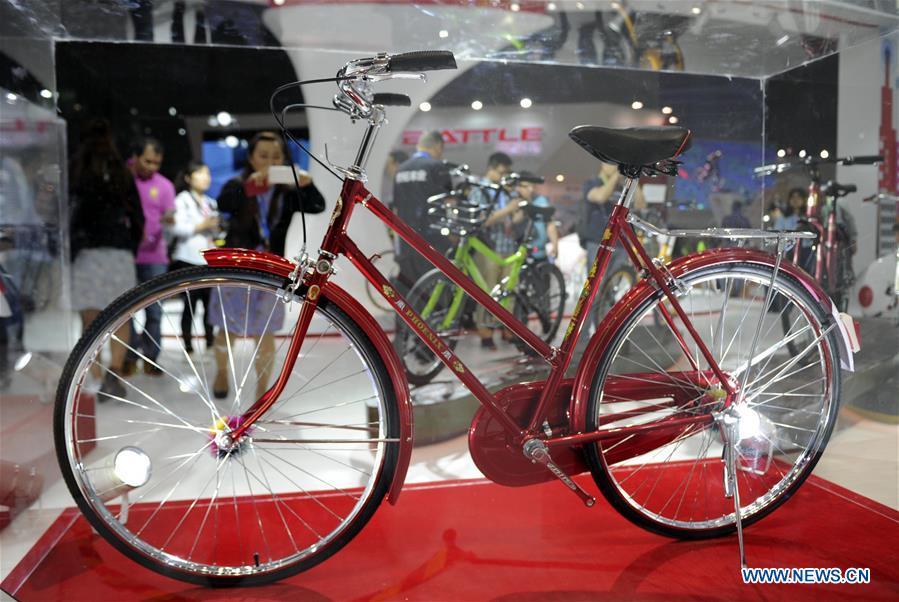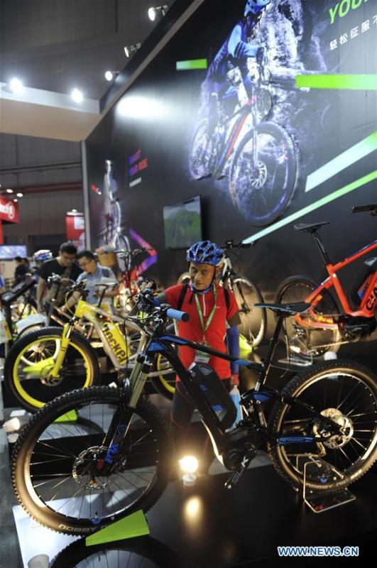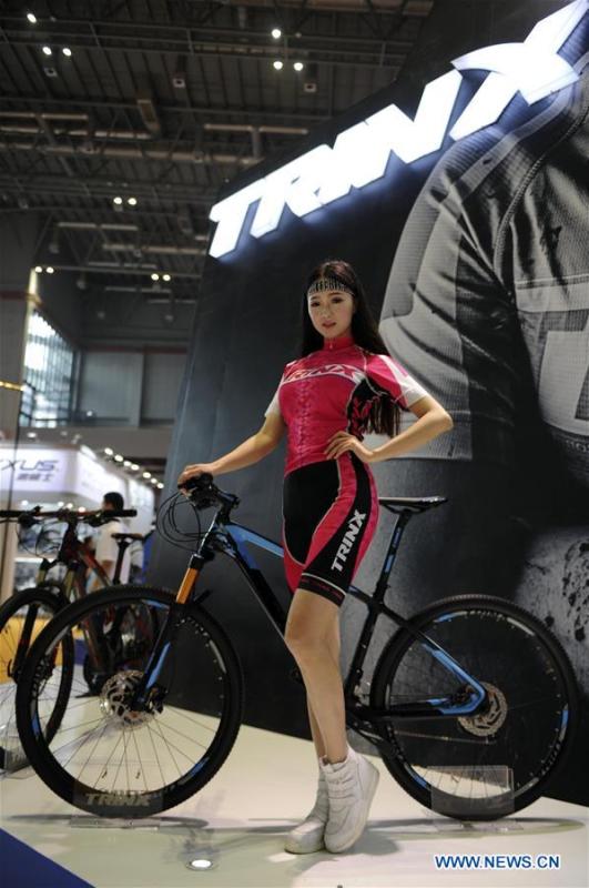 An exhibitor introduces a bicycle during China Cycle 2017, in Shanghai, east China, May 6, 2017. The bicycle-themed expo kicked off here on Saturday, attracting 1,226 enterprises from more than 20 countries and regions. (Xinhua/Ma Yan)