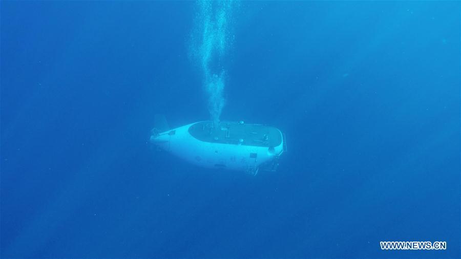 Frogmen prepare to return to the ship "Xiangyanghong 09" from Jiaolong in South China Sea, May 5, 2017. Jiaolong, China's manned submersible, discovered a collection of polymetallic nodules in Puyuan Seamount in the South China Sea on Friday . (Xinhua/Liu Shiping)
