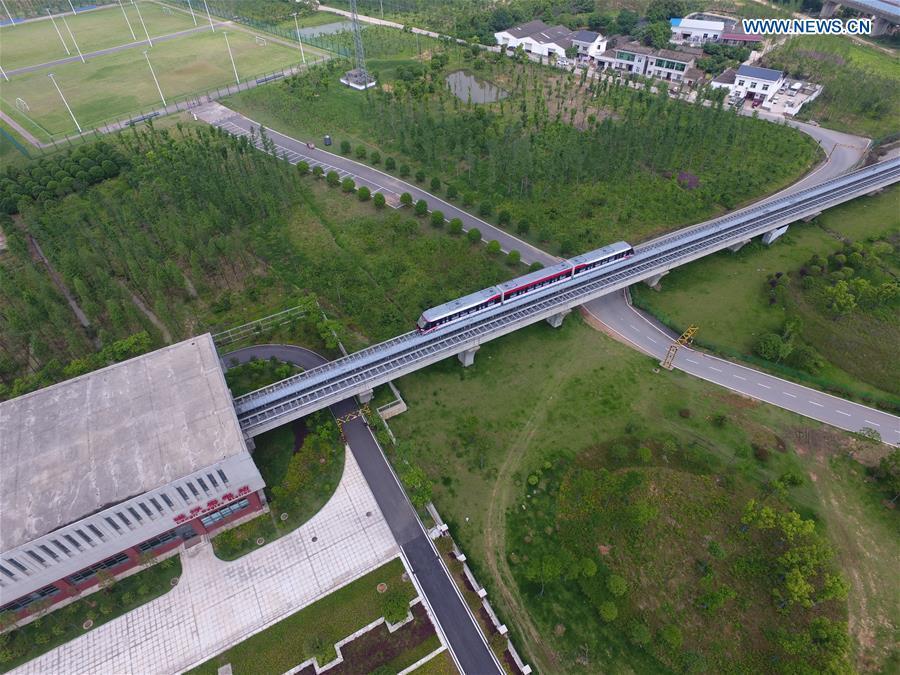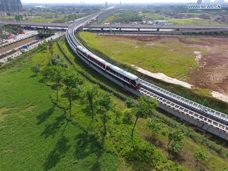 Photo taken on May 4, 2017 shows a maglev train in Changsha, capital of central China's Hunan Province. China's first middle-to-low speed magnetically levitated (maglev) rail line in Changsha has safely operated for one year. The maglev shuttles between Changsha's south railway station and the airport, with one stop in between. (Xinhua/Long Hongtao)