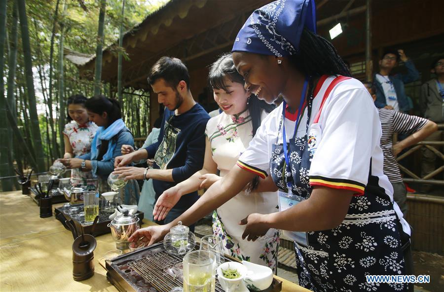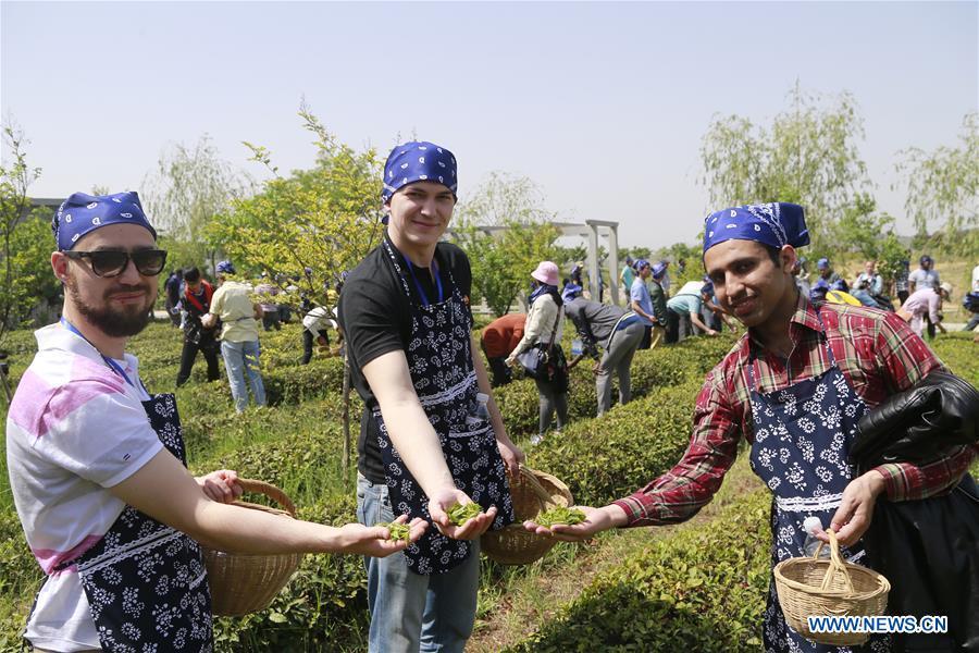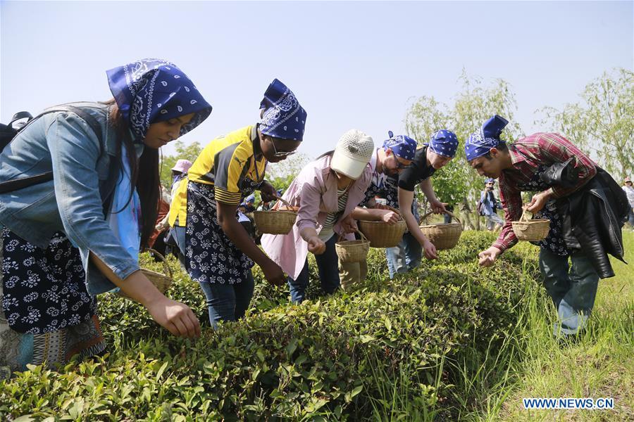 Foreign students pick tea leaves in Haiqing Township of Qingdao, east China's Shandong Province, May 7, 2017. Ninety foreign students of China University of Petroleum and Shandong University of Science and Technology took part in an activity Sunday to experience traditional Chinese tea culture. (Xinhua/Liu Jishun)