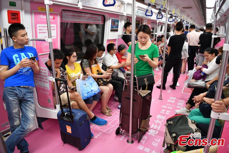 A subway train features pink decorations to encourage people to declare their feelings in Shenzhen City, South China’s Guangdong Province, May 8, 2017. The train includes words collected from Shenzhen’s subway commuters. Some singles said they want to find their other half in the city. The event will run for one month. (Photo: China News Service/Chen Wen)