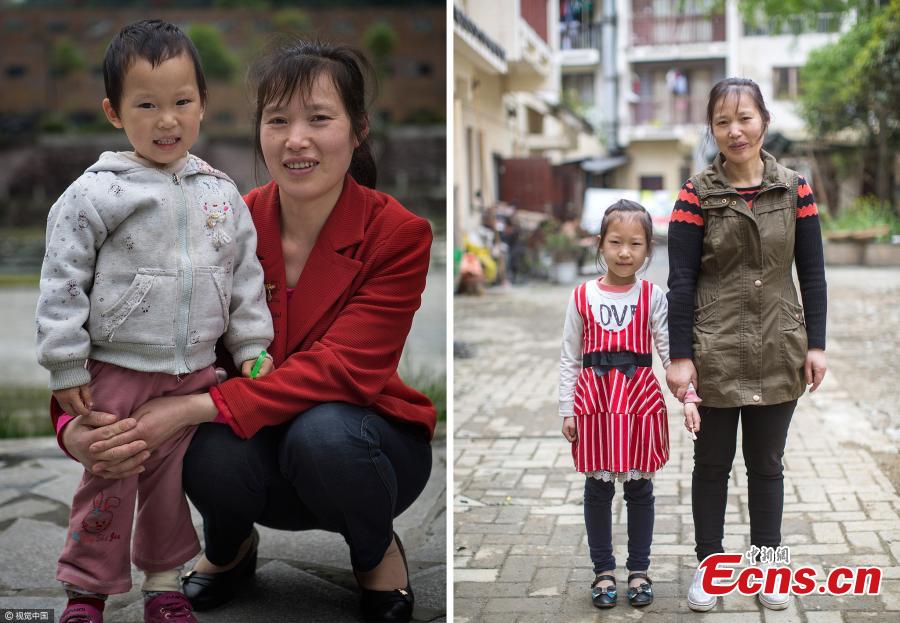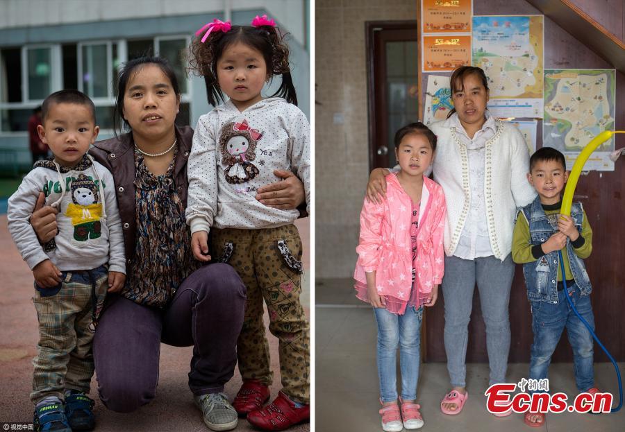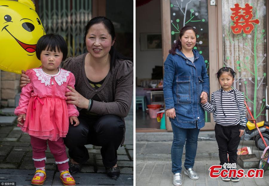 Left photo was taken in 2013 and right in 2017. Li lost two daughters in the earthquake. Last year, her husband also died in an accident, and she had to close her inn in Yingxiu and move to Dujiangyan for work. In the morning, she first drops her daughter at school and then rushes to her employer's home for work. She picks up her daughter from school in the evening after her employer returns home. The life is tough, but the most difficult days ended when her little girl was born. She said her biggest wish is to bring her daughter up. (Photos/VCG)