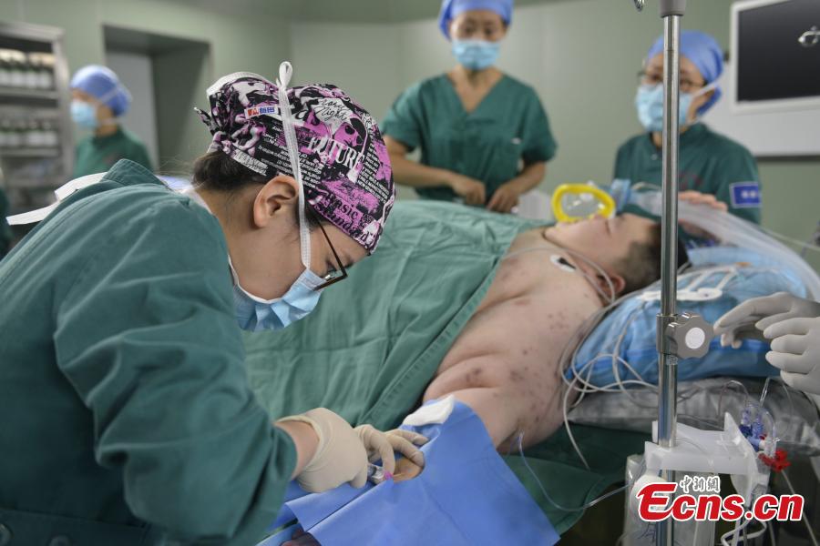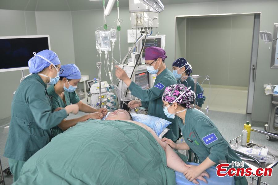 Huang Tao (alias) prepares for a surgery to reduce his weight at the No.3 People’s Hospital in Chengdu City, the capital of Southwest China’s Sichuan Province, May 11, 2017. The 26 year old, a native of central Wuhan city, was 265 kilograms when he arrived in Chengdu in an ambulance three months ago. His weight dropped to 220 kilograms after receiving training to lessen the symptoms of respiratory failure and hypoxemia, a low level of oxygen in the blood. The surgery is expected to reduce his weight to 110 kilograms. (Photo: China News Service/Zhong Xin)