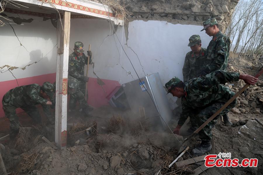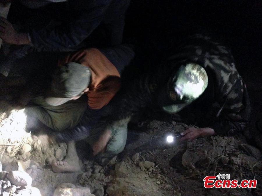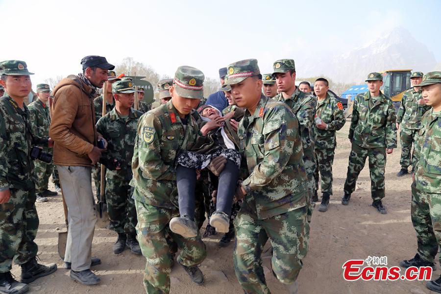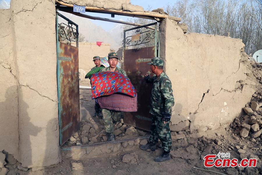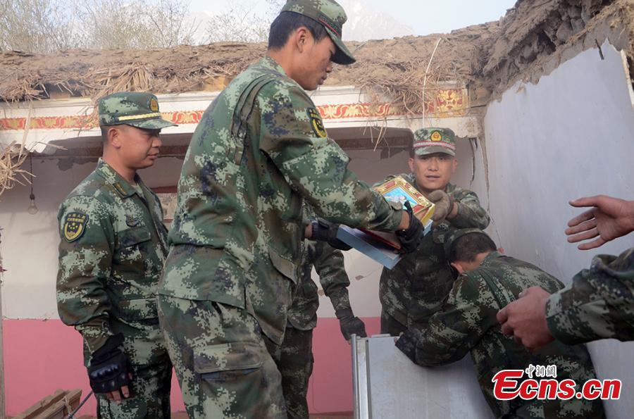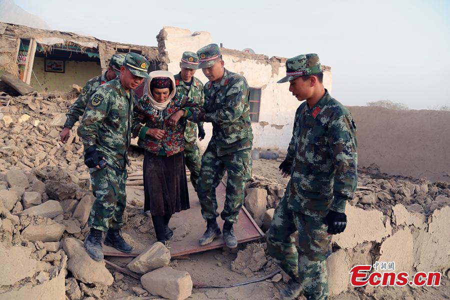 Chinese border soldiers rescue residents affected by an earthquake in Taxkorgan County, Northwest China's Xinjiang Uygur Autonomous Region, May 11, 2017. The rescuers saved 12 people from rubble and evacuated more than 200 to safe places. Some soldiers had to use their bare hands to pull those trapped in collapsed buildings. Eight people have been confirmed dead and 23 others injured after a 5.5-magnitude earthquake jolted Taxkorgan County at 5.58am Thursday. (Photo: China News Service/Sun Kechang)