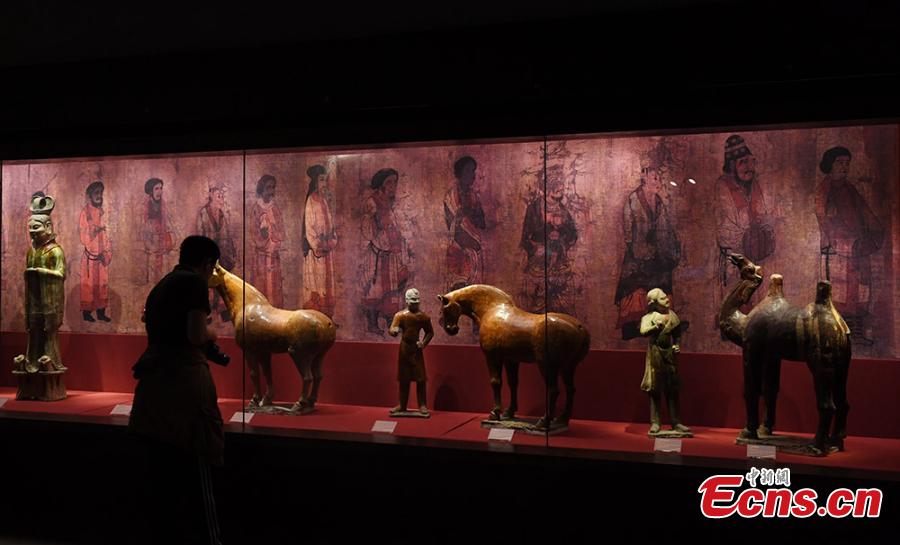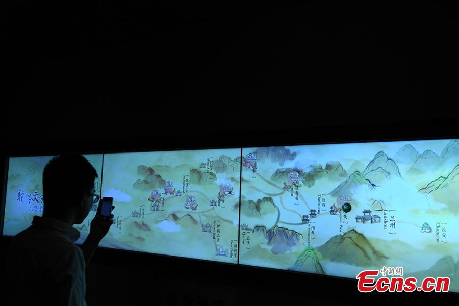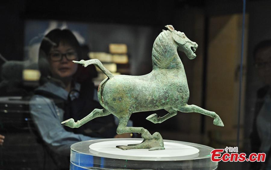 Relics are on display at a Silk Road themed show in Gansu Provincial Museum in Lanzhou City, capital of Northwest China’s Gansu Province, May 11, 2017. The museum is presenting 420 historical and cultural relics related to the ancient trade route, including painted pottery, bronze ware, jade, gold and silver articles, and stone sculptures, collected from 28 regional museums in the province. (Photo: China News Service/Yang Yanmin)
