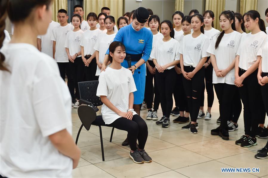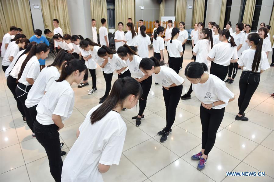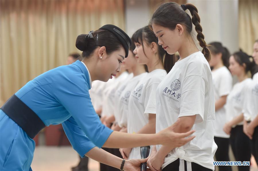 Volunteers for the 2017 BRICS Summit from Xiamen University take part in an etiquette training in Xiamen, southeast China's Fujian Province, May 10, 2017. The 2017 BRICS Summit will be held in September in Xiamen. (Xinhua/Song Weiwei)