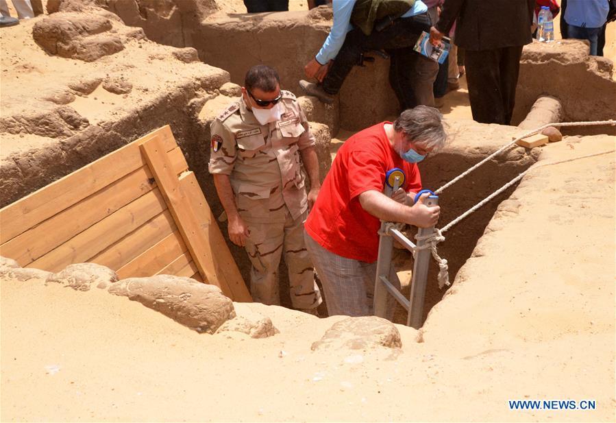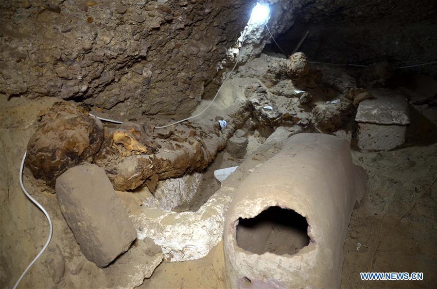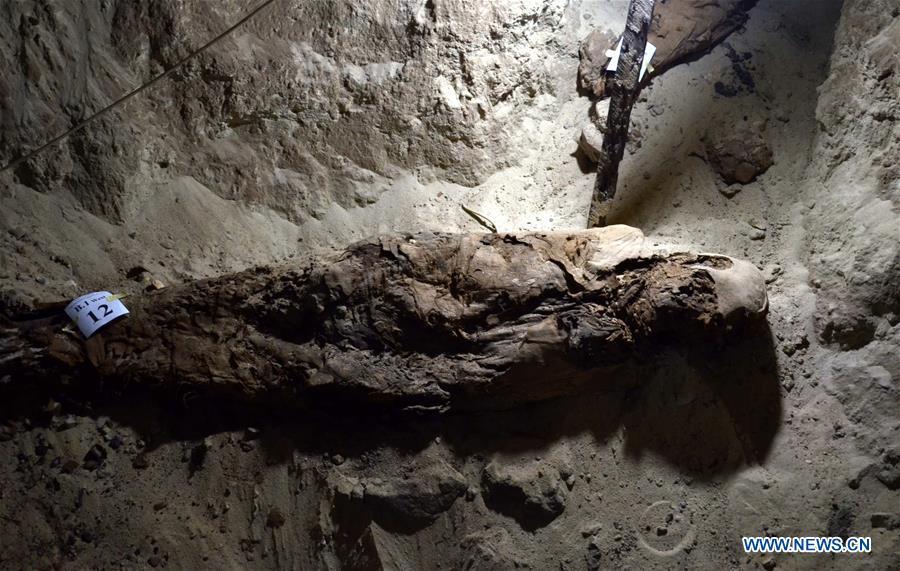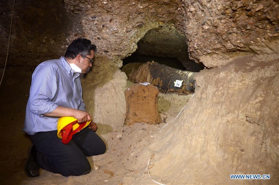 Egyptian Antiquities Minister Khaled el-Anany looks at a newly unearthed mummy in a catacomb in Touna el-Gabal district of Minya province, 234 km far from Cairo, Egypt on May 13, 2017. Egyptian archaeologists have discovered on Saturday 17 mummies in catacombs in Minya province, in central Egypt, the antiquities ministry announced on Saturday. (Xinhua/Ahmed Gomaa)