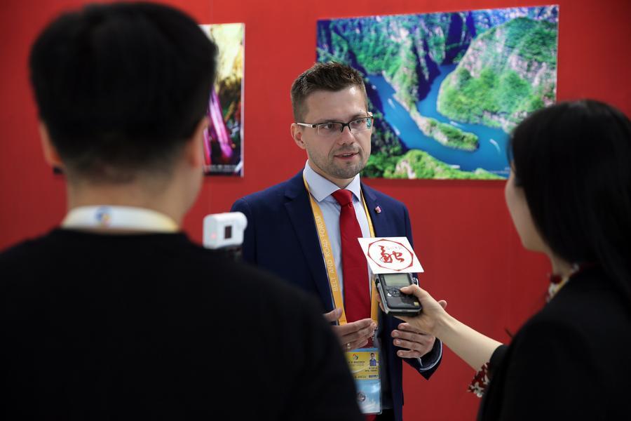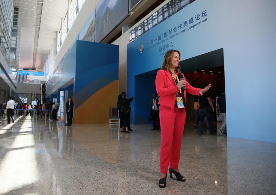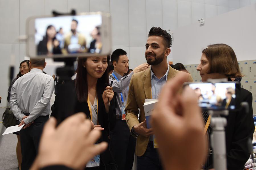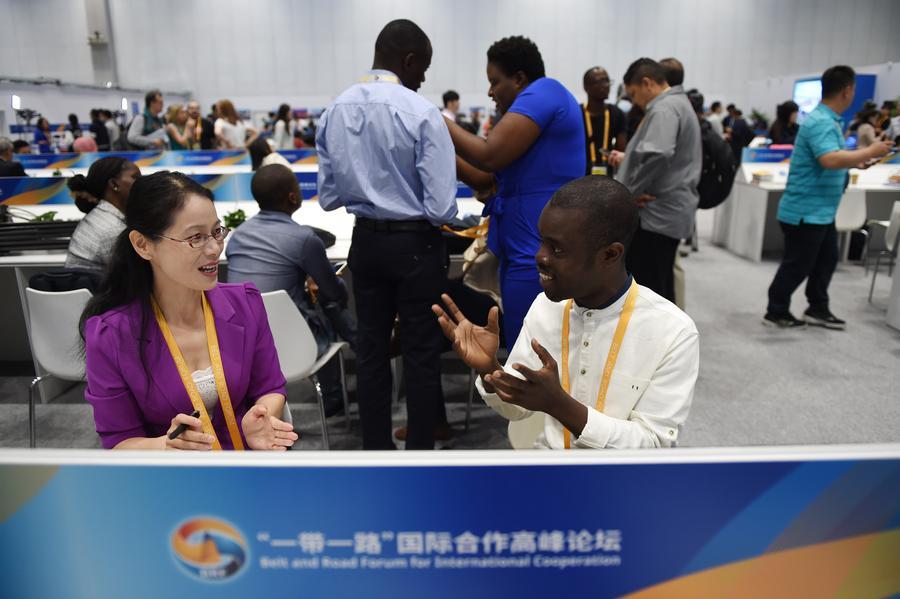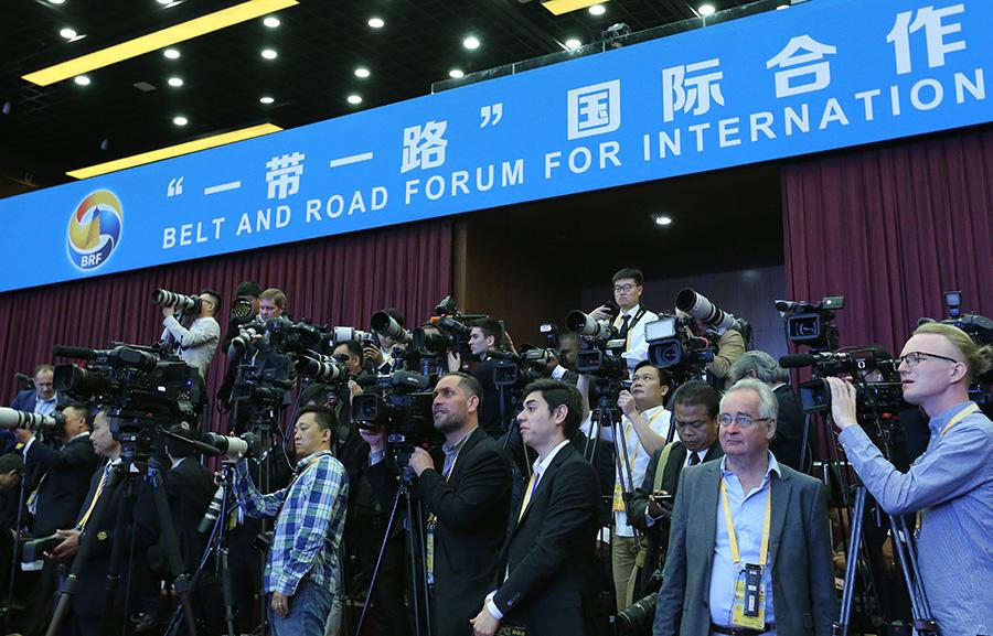 Foreign reporters discuss events at the media center for the Belt and Road Forum (BRF) for International Cooperation at the National Convention Center in Beijing on Sunday. (Photo/China Daily)