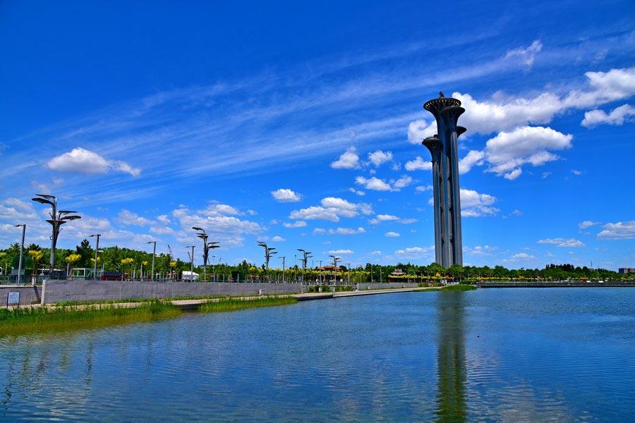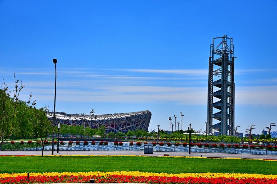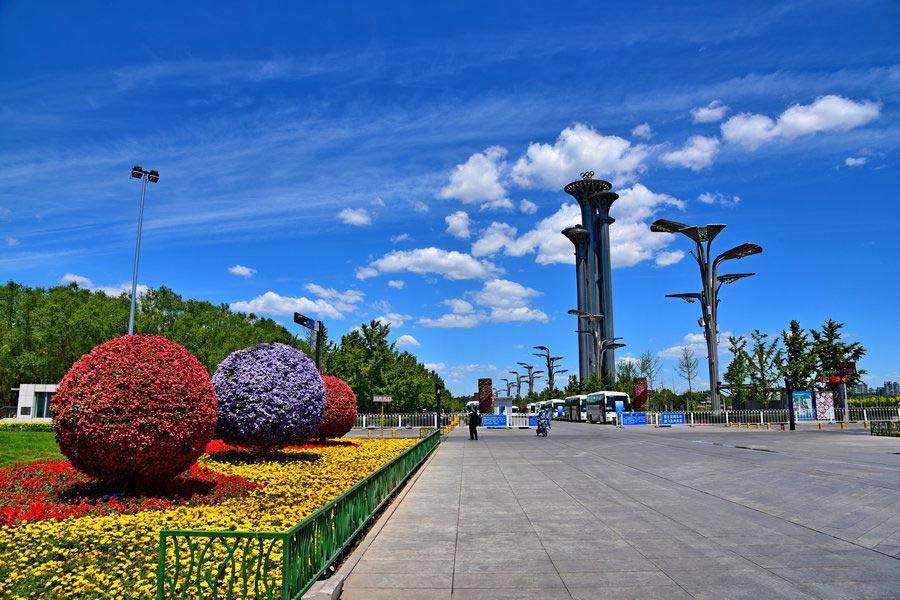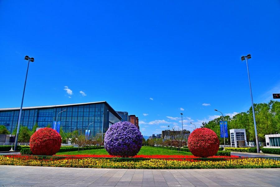 Blue sky and and colorful flowers brighten Beijing's Olympic Park, May 14. Some of the Belt and Road Forum for International Cooperation's high-level meetings were held at the China National Convention Center. (Photo/chinadaily.com.cn)