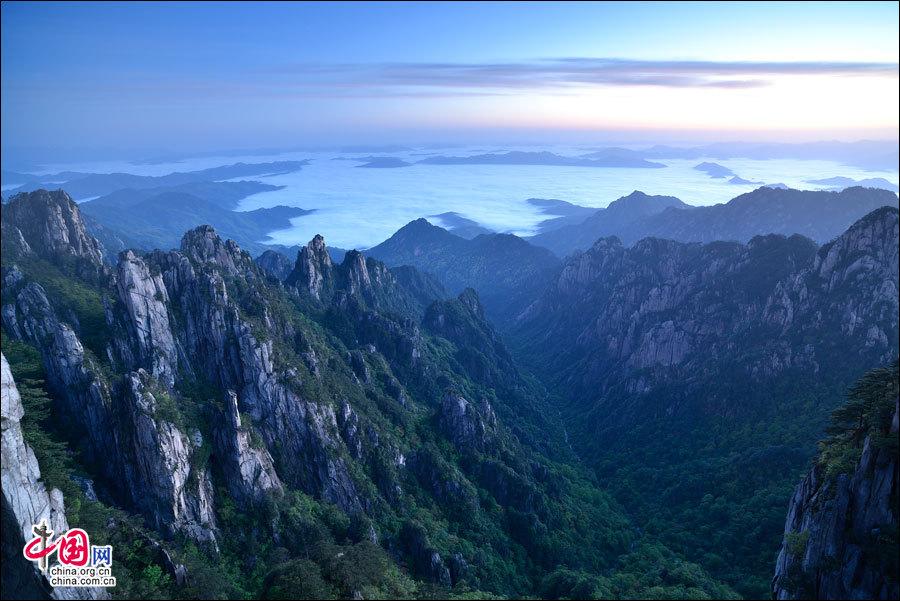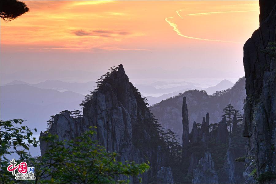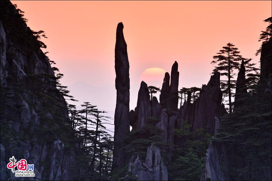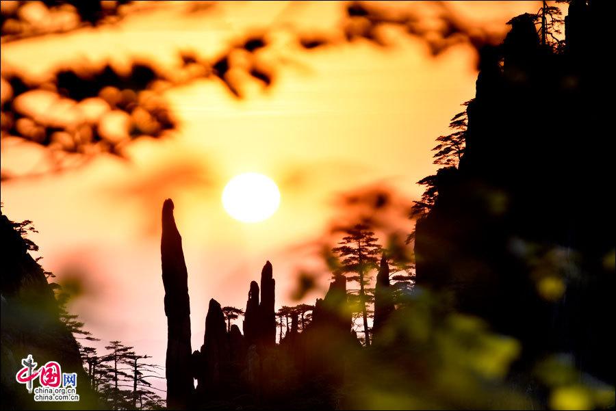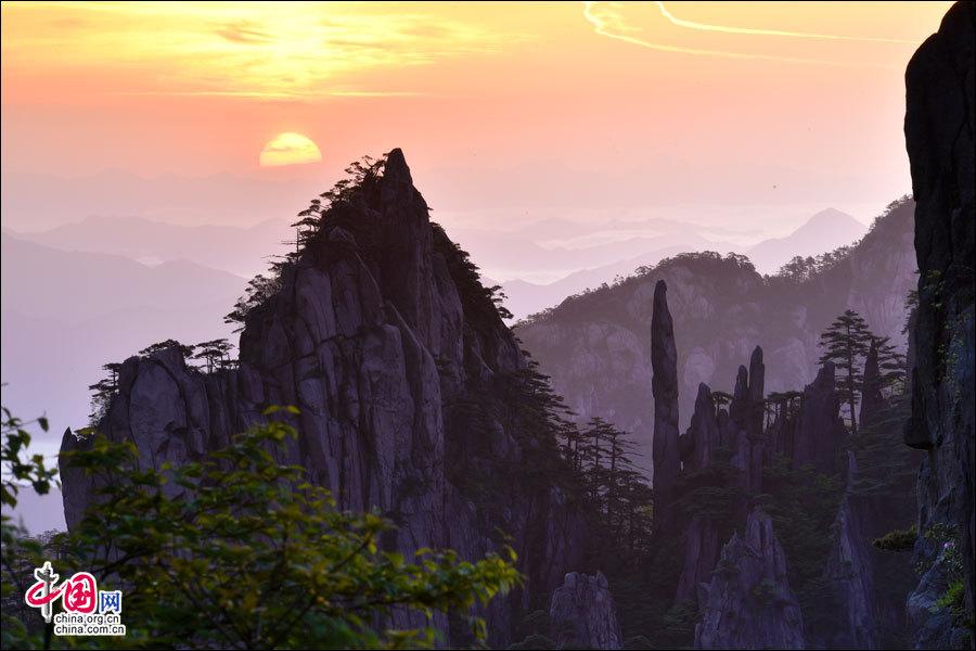 Sunrise viewing at Muont Huangshan is said by some tourists to be a once-in-a-lifetime experience. You can stay overnight up the mountain and get up early the next morning to catch the majestic moment of the sunrise. (Photo/China.org.cn)
