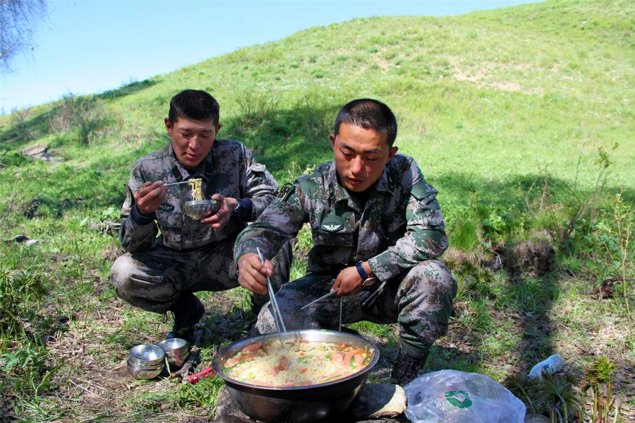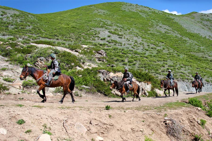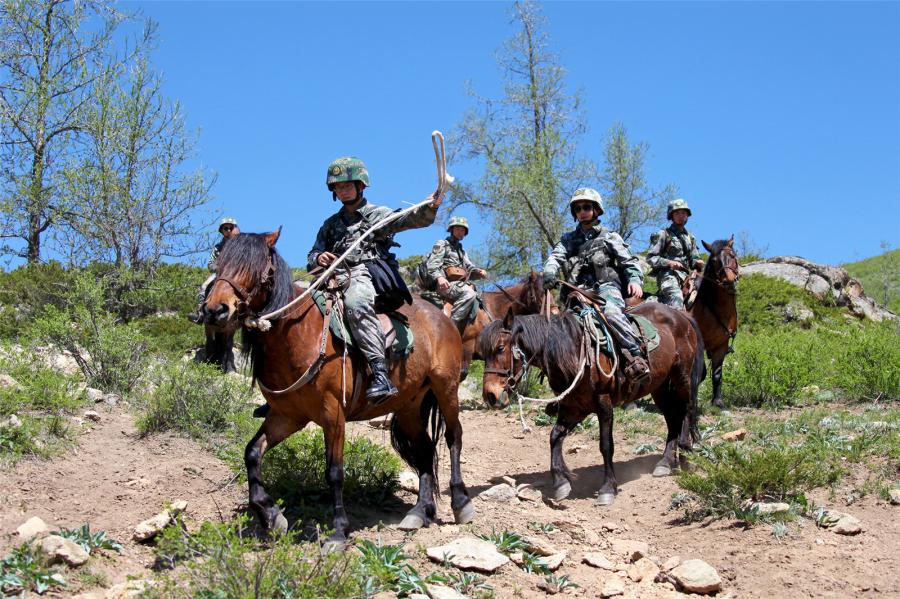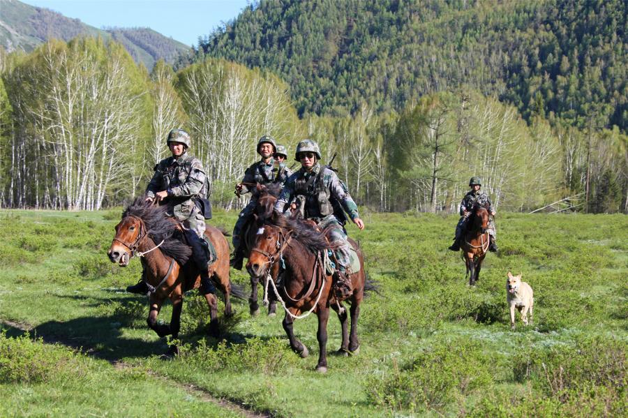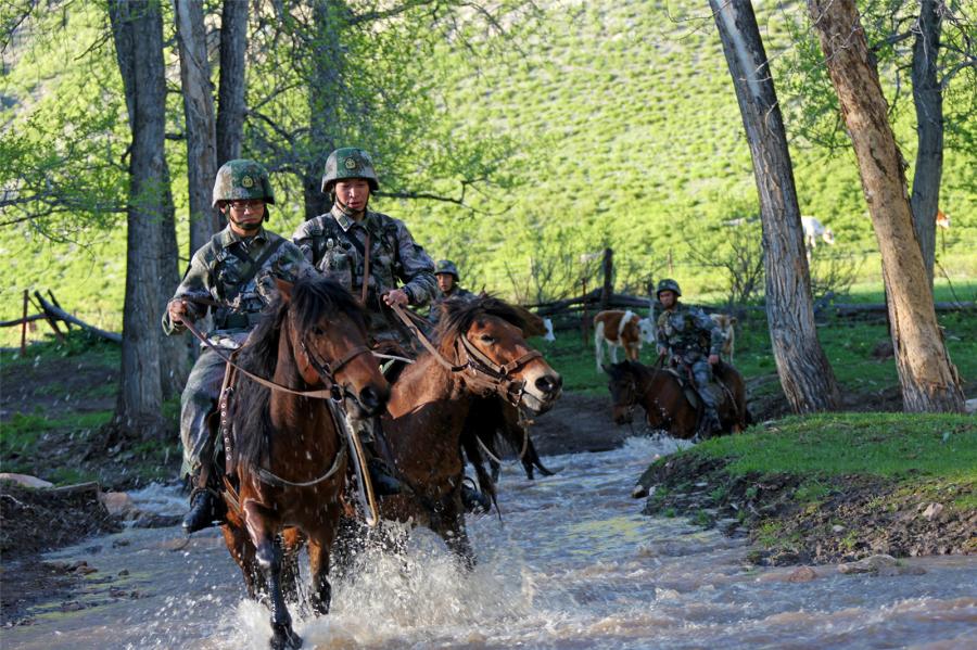 Soldiers on horseback wade through a stream during patrolling the border areas on May 12, 2017. They are assigned to the PLA border defense troops stationed in Altay of northwest China's Xinjiang Uygur Autonomous Region. (81.cn/Yang Zizhou)